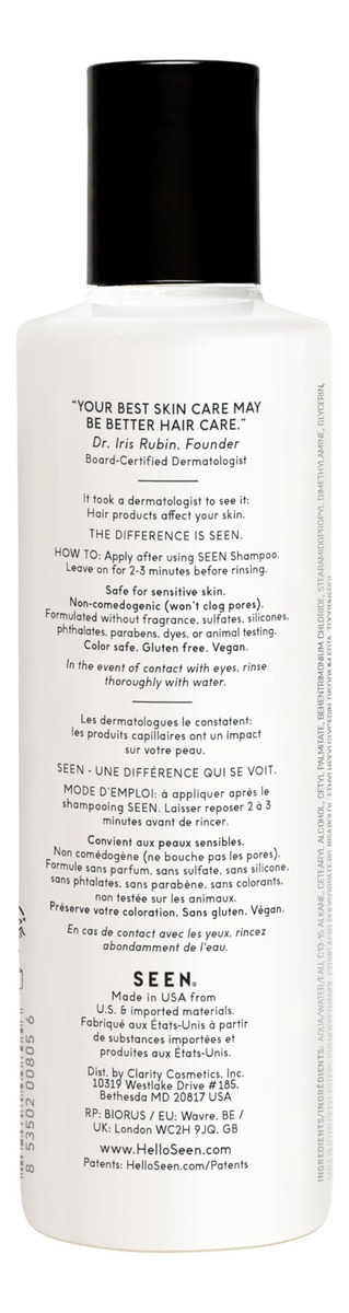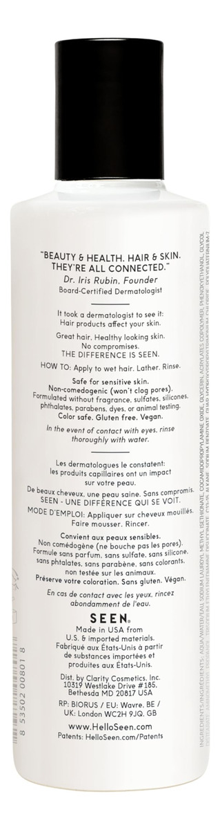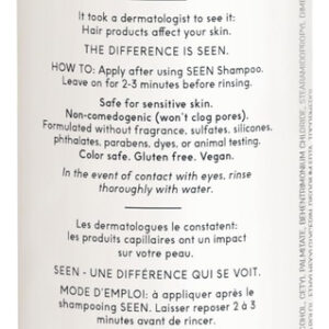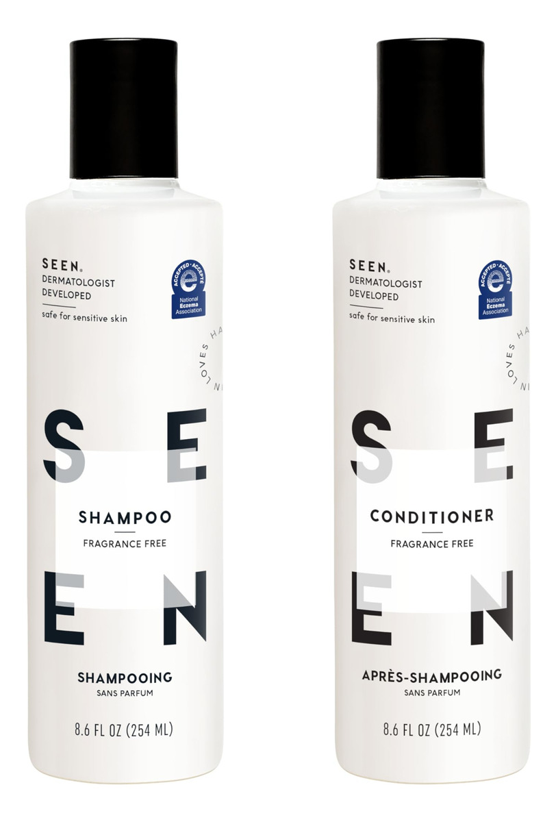 Conjunto de xampu e condicionador — O QUE É: Uma dupla de xampu e condicionador vegana, não comedogênica, desenvolvida por dermatologistas, que limpa e condiciona suavemente os cabelos sem irritar. O shampoo fornece uma espuma luxuosa, enquanto o condicionador desembaraça, suaviza e alisa o cabelo para um brilho saudável. Seguro para peles sensíveis, propensas a acne e eczema. — Livre de: Este pacote não contém sulfatos, silicones, ftalatos, parabenos, corantes, óleos que obstruem os poros, conservantes liberadores de formaldeído, cocamidopropil betaína e glúten. Também é aprovado pela PETA e pelo Leaping Bunny, o que o torna vegano e livre de crueldade. – BOM PARA: Ideal para todos os tipos de cabelo, este shampoo e condicionador sem sulfato e sem cor pode ser usado diariamente. A dupla reduz o frizz, adiciona brilho e ajuda a proteger o cabelo contra quebras, mantendo uma sensação de leveza. Seguro para peles com tendência a eczema e acne. – CLINICAMENTE COMPROVADO: Ambos os produtos são desenvolvidos por dermatologistas para serem não comedogênicos (não obstruem os poros) e não irritantes, o que os torna perfeitos para pessoas com pele sensível. Seguro para uso diário em todos os tipos de cabelo. – SEM PERFUME: A formulação sem fragrância da SEEN garante que não haja adição de óleos essenciais, fragrâncias mascaradoras ou aditivos aromáticos. Qualquer perfume é derivado naturalmente de ingredientes crus, garantindo uma experiência limpa e sem fragrância, adequada para peles sensíveis.