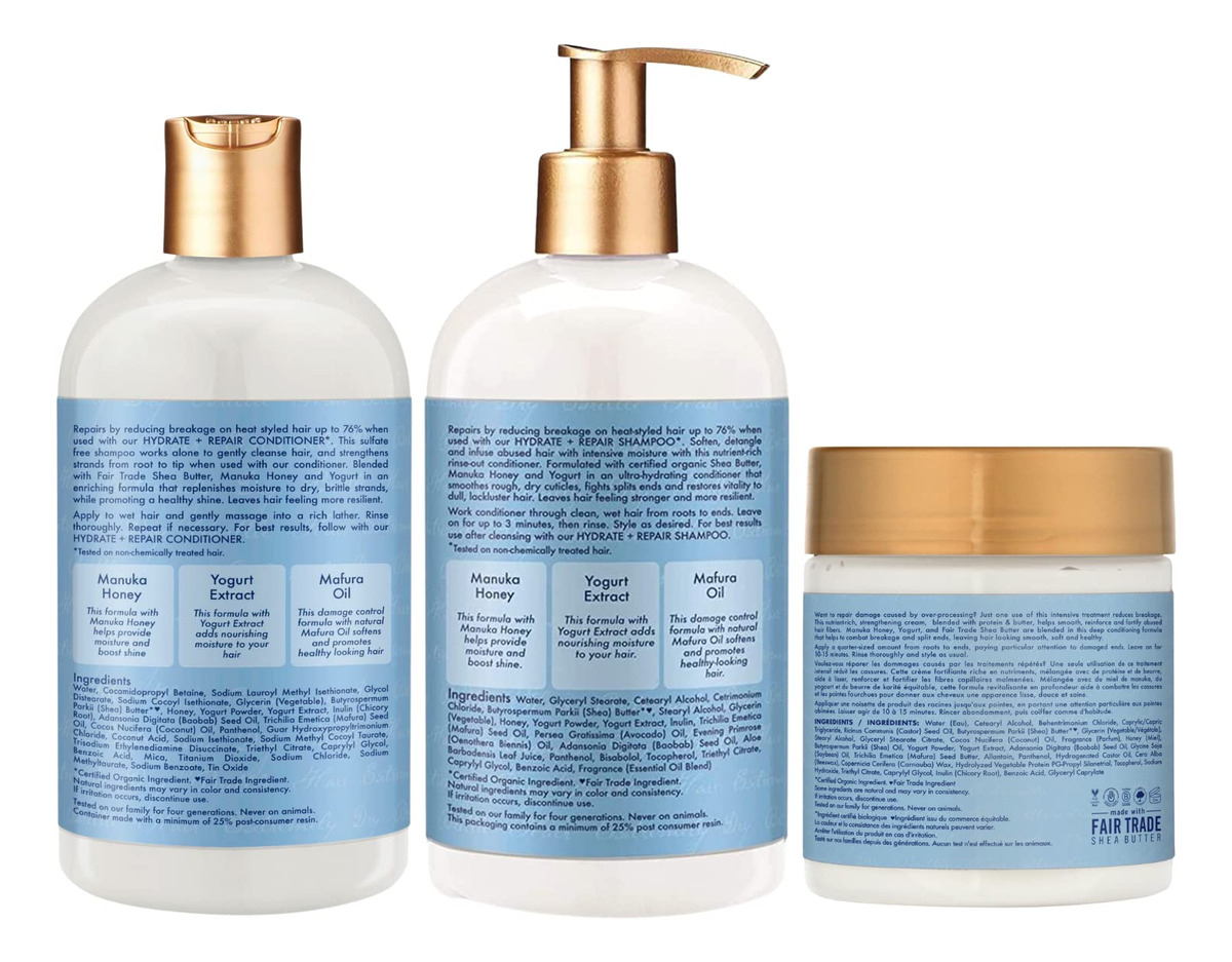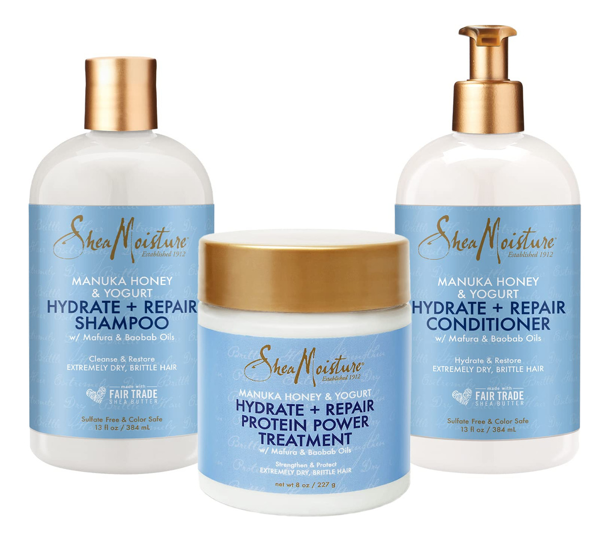 This Shea Moisture Manuka Honey and Yogurt Shampoo is completely sulfate-free, and it still produces luxurious lather that gently cleanses your follicles while infusing your hair with intensive moisture. Designed to be a protein treatment for damaged hair, our formula contains reconstructive proteins and shine-enhancing nutrients. Formulated with certified organic Shea Butter, we build on this strong moisturizing foundation and provide even more hydration and hair follicle healing properties with ultra-moisturizing Manuka Honey. Protein comes from the addition of Yogurt Powder and Yogurt Extract, natural proteins that provide their own richness. For extra ultra-hydration, we include Baobab Oil, Coconut Oil and Mafura Oil, creating an easy and gentle reparative formula to restore moisture and transform coarse hair, improving smoothness, texture and manageability. Regular use leaves hair strands fully restored to their healthy state and looking their best. Shea Moisture Manuka Honey and Yogurt Conditioner repairs by reducing breakage on heat-styled hair up to 76% when used with our HYDRATE + REPAIR SHAMPOO. Soften, detangle and infuse abused hair with intensive moisture with this nutrient-rich rinse-out conditioner. Formulated with certified organic Shea Butter, Manuka Honey and Yogurt in an ultra-hydrating conditioner that smoothes rough, dry cuticles, fights splits ends and restores vitality to dull, lackluster hair. Leaves hair feeling stronger and more resilient. Shea Moistures Manuka Honey & Yogurt Hydrate + Repair Protein-Strong Treatment with Mafura & Baobab Oils is powered by reparative proteins and butters in a nutrient-rich strengthening cream to naturally reinforce and revitalize over-processed, abused hair fibers. In this deep conditioning hair mask, certified organic Shea Butter, ultra-moisturizing Manuka Honey and Yogurt are blended with natural oils to fortify weak strands, and c – CLEANSES & STRENGTHENS: Shea Moisture Manuka Honey and Yogurt Hydrate+Repair Shampoo is a moisturizing shampoo for damaged hair that works alone to gently cleanse hair and strengthen strands from root to tip when used with our conditioner. – RESTORES & REPAIRS: Restore and repair with this moisture Shampoo by Shea Moisture that replenishes moisture to dry, brittle strands, while promoting a healthy shine. – SOFTENS & DETANGLES: Shea Moisture Manuka Honey and Yogurt Hydrate & Repair Conditioner is a deep conditioner and rinse-out conditioner that softens, detangles and infuses damaged hair with intensive moisture for hair repair. – RESTORES HAIR VITALITY: This deep hair conditioner smooths rough, dry cuticles and seals for split end repair; use this damaged hair treatment to restore vitality to dull, lackluster hair for healthy hair that lasts. – REINFORCES & REVITALIZES: With its blend of all-natural ingredients, including organic Shea Butter, Shea Moistures Manuka Honey & Yogurt Hydrate + Repair Protein-Strong Treatment Masque gives your hair new life by providing dry hair benefits from reparative proteins that naturally reinforce and revitalize over-processed, abused hair fibers.