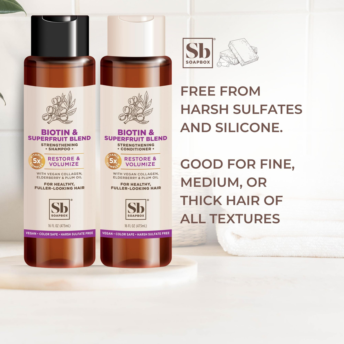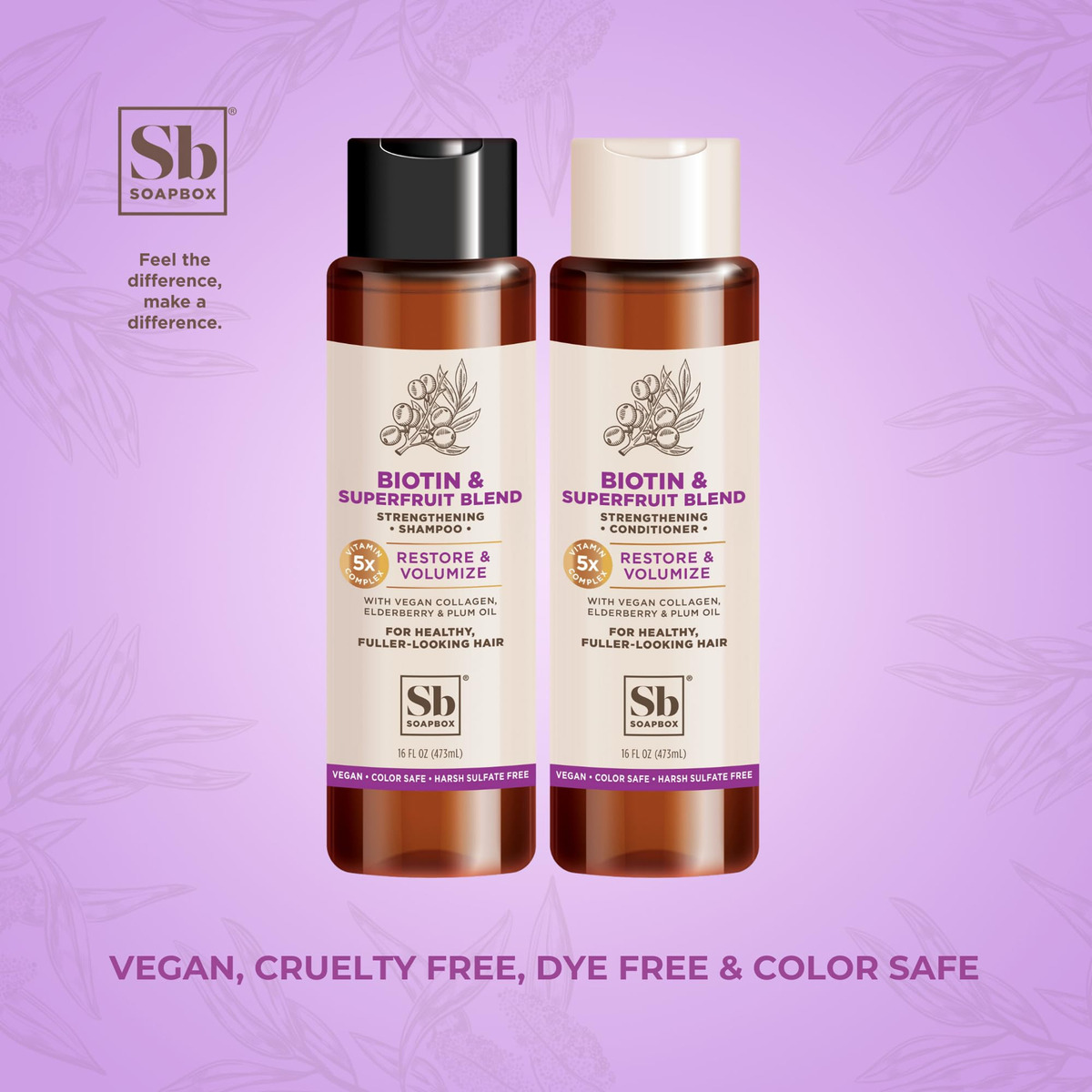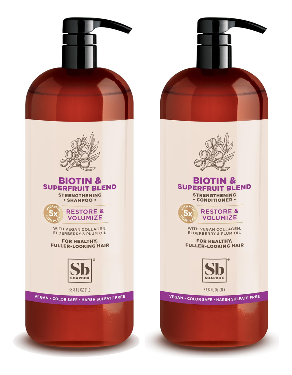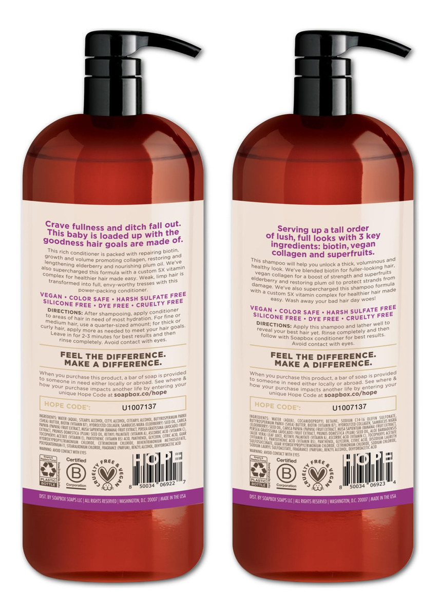Os conjuntos de shampoo e condicionador Soapbox são a solução definitiva para cabelos saudáveis e brilhantes! Formulada com uma mistura única de ingredientes nutritivos, essa dupla dinâmica transformará sua rotina de cuidados com os cabelos. Nosso shampoo sem sulfato limpa suavemente, enquanto o condicionador hidrata profundamente, deixando seu cabelo sedoso e manejável. Diga adeus ao frizz e olá ao brilho brilhante, pois esses produtos funcionam em harmonia para fortalecer e proteger seus fios. Nossos produtos para o cuidado do cabelo contêm todos os ingredientes naturais que não contêm cor, silicone, glúten e não contêm sulfatos, SLES, SLS ou parabenos. Experimente o luxo de cuidar do cabelo com qualidade de salão no conforto da sua casa. Explore toda a nossa linha de sabonetes, produtos para o cuidado do cabelo, sabonetes corporais, loções, esfoliantes corporais e mais produtos de autocuidado. – SHAMPOO E CONDICIONADOR DE BIOTINA dão um toque luxuoso à sua rotina diária. A superfruta se mistura com biotina para cabelos grossos e macios ao toque. Nossa fórmula é suave o suficiente para todos os tipos de cabelo para homens e mulheres. – O SHAMPOO REPARADOR revive seus fios para uma aparência espessa, volumosa e saudável. Misturado com biotina para cabelos mais cheios, colágeno vegano para estimular o crescimento saudável do cabelo e superfrutas de sabugueiro e óleo de ameixa restaurador para proteger os fios contra danos. – O CONDICIONADOR FORTALECEDOR transforma cabelos secos e flácidos em mechas cheias, ricas e volumosas. Este condicionador rico contém biotina reparadora, promove o crescimento e o volume do colágeno, restaura e alonga o sabugueiro e o óleo nutritivo de ameixa. – XAMPUS E CONDICIONADORES VEGANOS E SEM SULFATO são ecológicos e nunca foram testados em animais. Nossos produtos para o cuidado do cabelo contêm ingredientes totalmente naturais que não contêm cor, silicone, glúten e sulfatos, SLES, SLS ou parabenos. – SINTA A DIFERENÇA, FAÇA A DIFERENÇA fazendo compras diárias de qualidade – a compra de um pacote de 2 xampus e condicionadores também doa um conjunto para alguém necessitado, apoiando nossa missão de sabonete = esperança. Acompanhe seu impacto inserindo seu Código de Esperança encontrado na parte de trás do pacote.