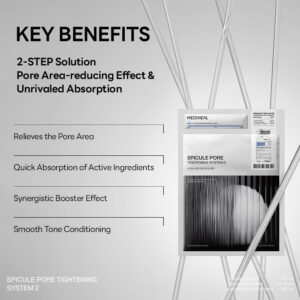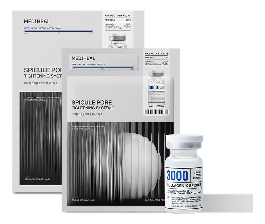 Conjunto de máscaras de sérum e gel para espículas Mediheal. – [Ingrediente especial da Mediheals] – Espícula de colágeno, o ingrediente especial da Mediheal inclui microcolágeno e espícula de 300 daltons para uma absorção eficaz. A espícula de 99% de alta pureza minimiza a irritação da pele. – [Solução em 2 etapas para melhoria do tamanho dos poros e absorção extraordinária] – Efeito visível de cuidado dos poros com uso único e efeito significativo com solução em 2 etapas. (15% de efeito de redução dos poros apenas com ampola, 29% do efeito com ampola e máscara de gel) – [Etapa 1 do sistema] – 3.000 ppm de colágeno (a ampola de espícula está incluída) para cuidar dos poros com sensação de aperto. Solução para problemas graves de poros e melhora da textura da pele com alta densidade. – [Etapa 2 do sistema] – A máscara de gel está incluída para uma absorção perfeita de ingredientes eficazes em 30 minutos. A máscara de gel opaca que contém colágeno em espícula se torna transparente à medida que a absorção avança. Projetado para absorção rápida e profunda. A máscara de gel cobre firmemente a área curva do rosto. – [Solução não irritante, incluindo espícula] – O sistema de tratamento de poros com espículas de colágeno Mediheal obteve a certificação de 'teste derma' e ingrediente não irritante da Alemanha. Pode ser usado em peles sensíveis.