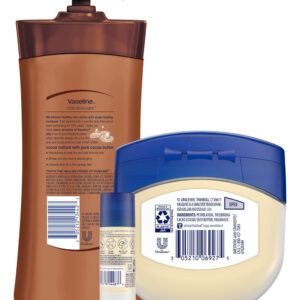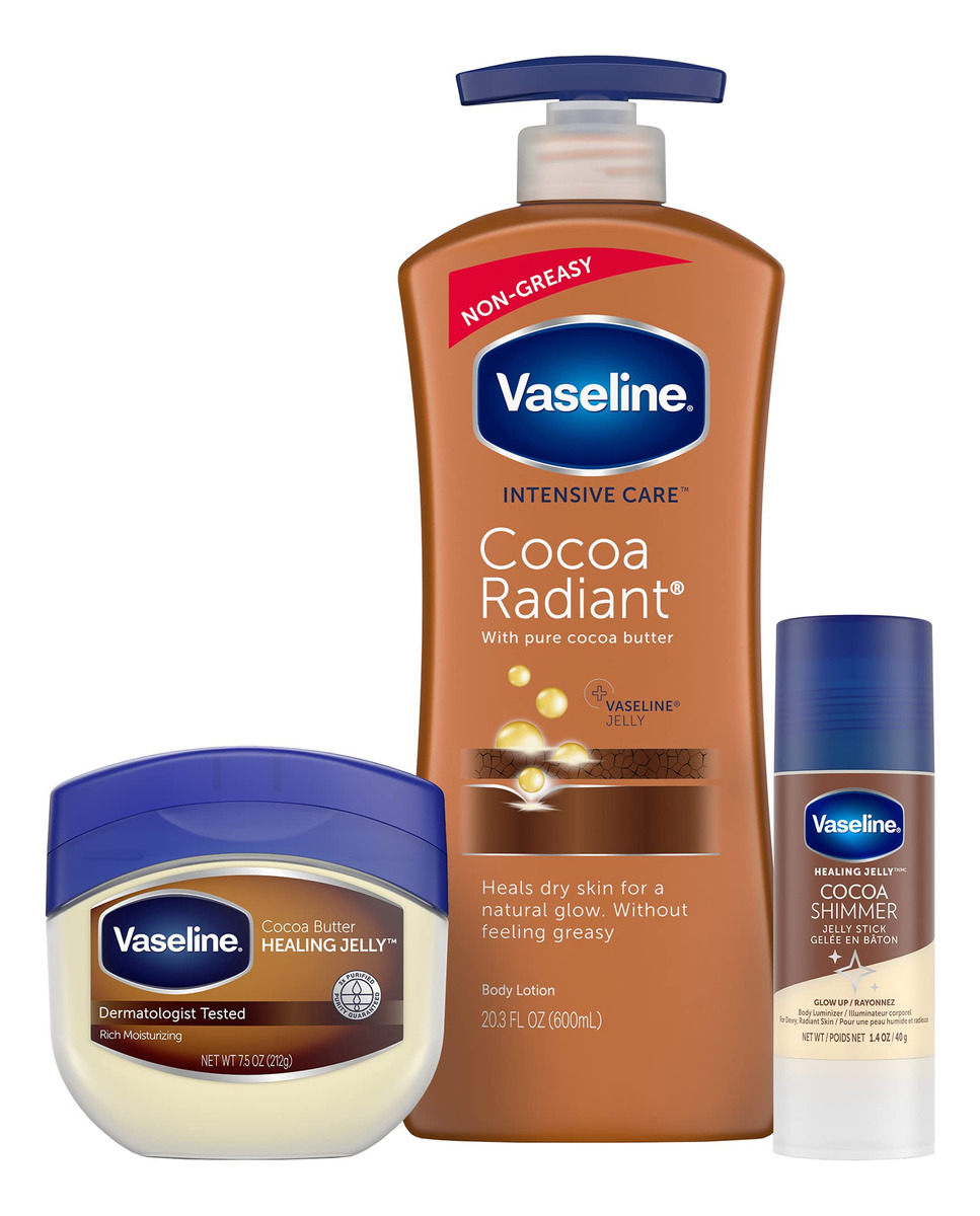 Restaure o brilho natural saudável e o toque macio da sua pele com todos esses produtos hidratantes de vaselina infundidos com manteiga de cacau. Aplique regularmente uma quantidade generosa em todo o corpo para reter a umidade e evitar ressecamento severo. Calcanhares, pés, mãos e cotovelos muito secos ficarão hidratados após uma aplicação generosa da pomada tópica leve com aroma de manteiga de cacau. Fáceis de aplicar e suavizar em toda a pele, a loção de vaselina para cuidados intensivos e a manteiga de cacau com geleia hidratante tripla purificada não são gordurosas e são de rápida absorção. O Cocoa Shimmer Jelly Stick oferece uma pele úmida e brilhante em um bastão TSA ideal para viagens. Basta remover a tampa e aplicar diretamente na pele. Não é necessário esfregar! Perfeito para aqueles pontos secos de difícil acesso, além de adicionar um brilho luminoso e radiante. Explore a linha completa de produtos de vaselina com vaselina e loções para cuidados intensivos para encontrar o produto certo para todas as necessidades de cuidados com a pele de sua família.