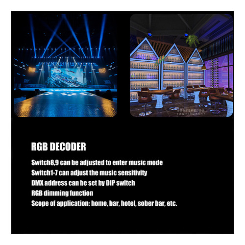Design ajustável: o gravador DMX de 4 canais pode entrar no modo de música ajustando o Switch8,9, o Switch1-7 pode ajustar a sensibilidade da música. 2.