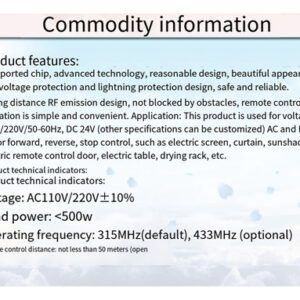 Aplicável a uma variedade de cenas, como tela elétrica, cortinas, persianas, portas de controle remoto elétrico, mesas elétricas, prateleiras de secagem, etc.