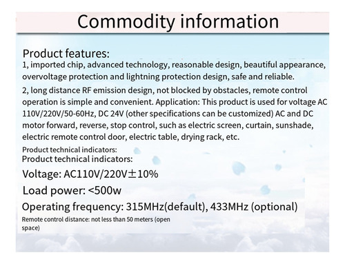transmissão de RF de longa distância seguro e confiável, não bloqueado por obstáculos, a operação do controle remoto é simples e conveniente