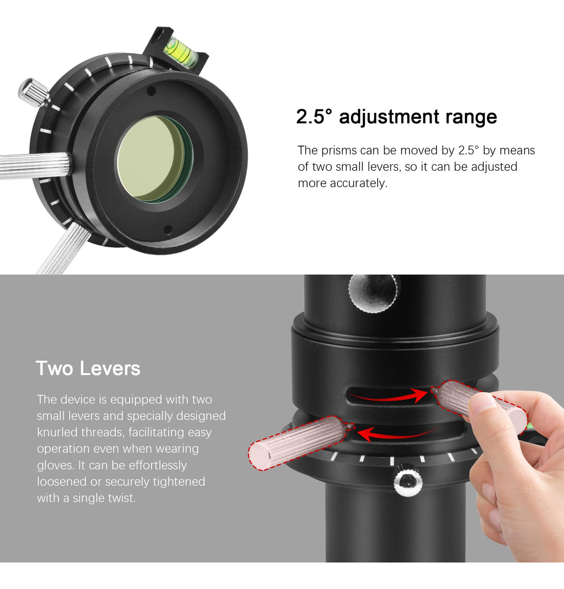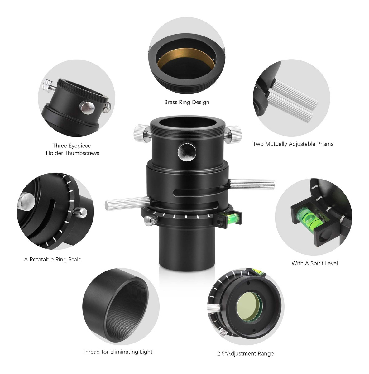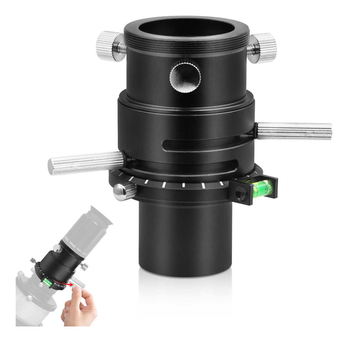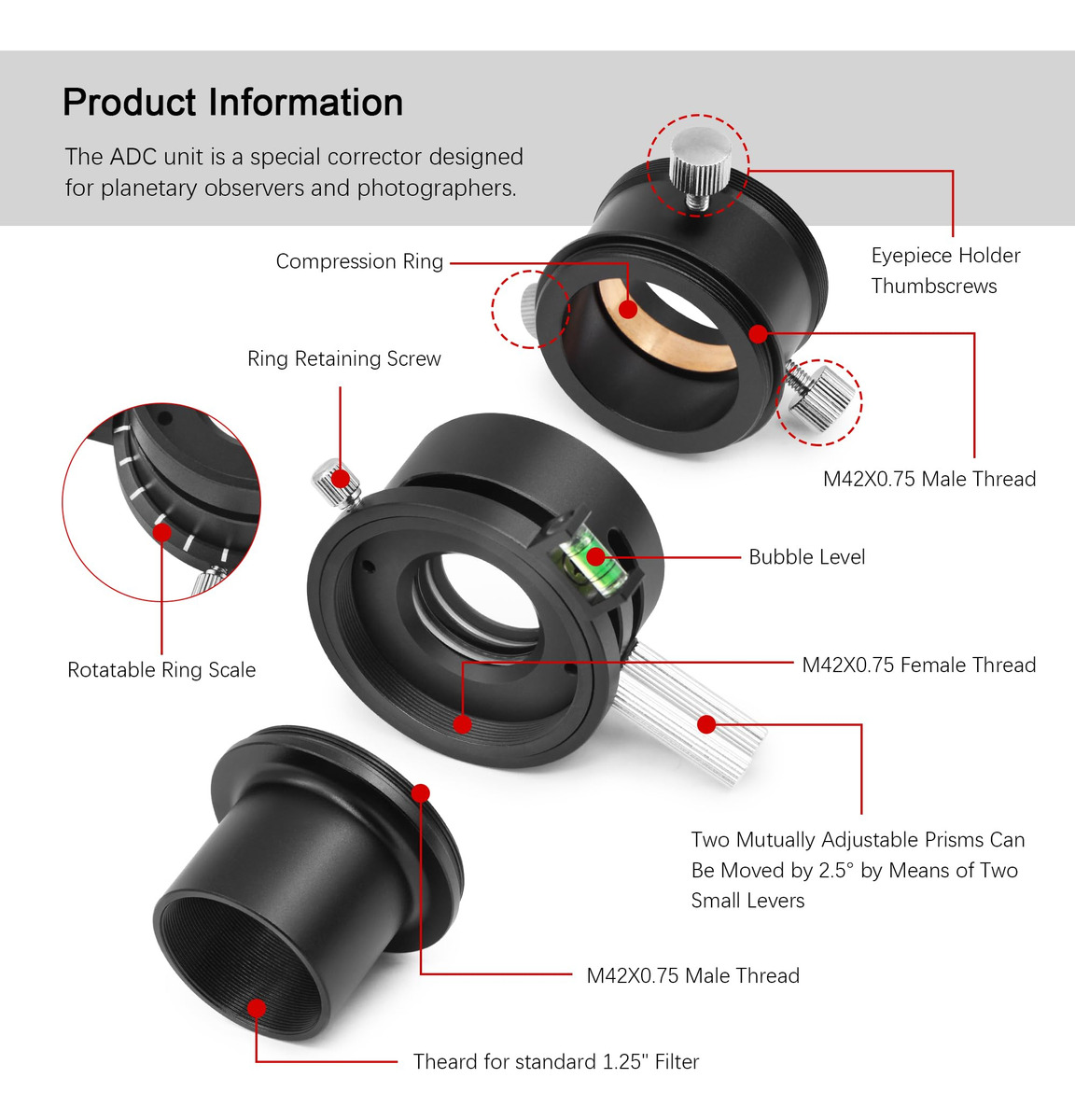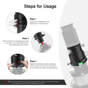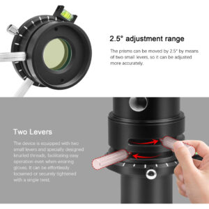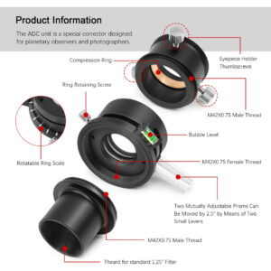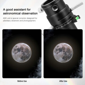 O que é um 'Corretor de Dispersão Atmosférica' ou ADC? A luz das estrelas e planetas é refratada pela camada de ar quando passa pela atmosfera terrestre. Essa refração varia muito dependendo do comprimento de onda da luz; um efeito conhecido como “dispersão”. Essa dispersão causa irritantes franjas coloridas nas bordas dos discos planetários. A atmosfera, portanto, age basicamente como a lente de um telescópio com aberração cromática. Por outro lado, isso significa que você verá até mesmo franjas de cores se estiver usando um telescópio de alta qualidade sem nenhuma aberração cromática inerente. A dispersão da atmosfera não pode ser corrigida pela ótica do seu telescópio. A solução – um corretor de dispersão atmosférica Astromania ADC! Esse pequeno componente fornece uma imagem planetária nítida que mostra muitos detalhes, mesmo quando está logo acima do horizonte. É aqui que entra o instrumento ADC compacto – o ADC consiste basicamente em dois prismas rotativos feitos de vidro de silicato. Os próprios prismas produzem uma certa extensão da própria aberração cromática, que é oposta à dispersão atmosférica. O ADC, portanto, corrige esse efeito irritante. A posição relativa dos prismas pode ser ajustada livremente por meio de um pequeno slide. Quem precisa do corretor? O efeito da dispersão atmosférica depende fortemente da elevação (altura) do objeto observado que aparece no céu. Quanto mais baixo o objeto estiver no céu, maior será o caminho que sua luz percorre pela atmosfera e, portanto, maior será a dispersão produzida. Os planetas brilhantes, em particular, nem sempre estão muito altos no céu, especialmente se você mora em altas latitudes. O ADC permite observar planetas, não apenas quando estão no alto do céu, mas mesmo quando nascem e se põem, com alto brilho e cor e sem aberração cromática. Isso torna você muito mais flexível na escolha do tempo de observação. – O corretor telescópico de dispersão atmosférica é um corretor especial projetado para observadores e fotógrafos planetários e lunares; reduza a mudança de cor causada pela dispersão atmosférica; você obterá imagens mais nítidas – As lentes de prisma têm um revestimento de banda larga antirreflexo especializado em várias camadas e dupla face; isso reduz a perda de luz; melhora a qualidade da imagem e garante alta transmitância de luz por 300 a 700 nanômetros; tornando-o ideal para astrofotografia – os prismas podem ser movidos em 2,5 gradue por meio de duas alavancas pequenas e defina uma deflexão de cor baixa ou muito alta; o resultado é uma correção ainda melhor da dispersão, especialmente no horizonte; a escala de anel giratória encontra rapidamente a configuração ideal para a próxima observação – ADC com dois adaptadores e rosca T: frontal e traseira equipadas com rosca T2; tubo lateral do telescópio de 1,25 polegadas com rosca de filtro e rosca T2; adaptador ocular de T2 a 1,25 polegadas com rosca T2 Rosca macho 75 e anel de compressão para câmera e ocular – O corretor de dispersão atmosférica apresenta uma estrutura totalmente metálica com acabamento anodizado preto; melhorando a durabilidade e a estética; perfil ultrabaixo – também adequado para observação visual e bino-visualizadores
