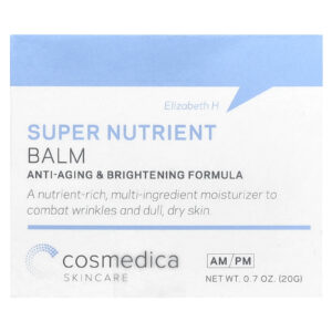 O Bálsamo Super Nutrient da Cosmedica Skincare combina os poderosos ingredientes ativos da semente de rosa-mosqueta, queratina, MSM e Vitamina C para fornecer os melhores resultados corretivos no combate à flacidez, envelhecimento e pele opaca. Esta fórmula rica em nutrientes penetra profundamente na pele para sobrecarregar as células epiteliais a partir de dentro. O tratamento antienvelhecimento e a hidratação são feitos com este hidratante nutritivo e restaurador da saúde.