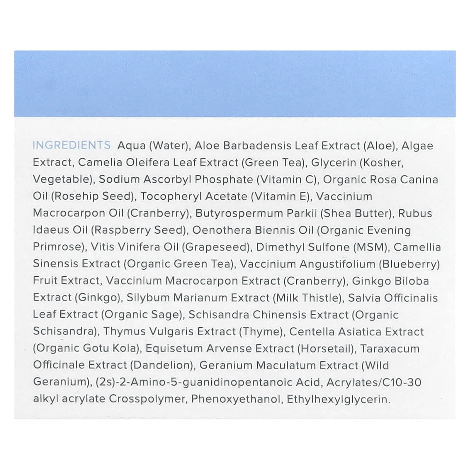 Aqua (água), extrato da folha de Aloe barbadensis (aloe), extrato de algas, extrato da folha de Camellia oleifera (chá verde), glicerina (kosher, vegetal), sodium ascorbyl phosphate (vitamina C), óleo de Rosa canina orgânica (semente de rosa-mosqueta), acetato de racealfatocoferol (vitamina E), óleo de Vaccinium macrocarpon (cranberry), Butyrospermum parkii (manteiga de karité), óleo de Rubus idaeus (semente de framboesa), óleo de Oenothera biennis (prímula orgânica), óleo de Vitis vinifera (semente de uva), dimetilsulfona (msm), extrato de Camellia sinensis (chá verde orgânico), extrato da fruta de Vaccinium angustifolium (mirtilo), extrato de Vaccinium macrocarpon (cranberry), extrato de Ginkgo biloba (ginkgo), extrato de Silybum marianum (cardo-mariano), extrato da folha de Salvia officinalis (sálvia orgânica), extrato de Schisandra chinensis (Schisandra orgânica), extrato de Thymus vulgaris (tomilho), extrato de Centella asiatica (gotu kola orgânico), extrato de Equisetum arvense (cavalinha), extrato de Taraxacum officinale (dente-de-leão), extrato de Geranium maculatum (gerânio selvagem), (2s)-2-amino-5-guanidinopentanoic acid, acrylates/c10-30 alkyl acrylate crosspolymer, fenoxietanol, ethylhexylglycerin.