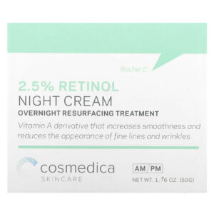 O Creme Noturno com Retinol a 2,5% para Rugas Profundas da Cosmedica Skincare protege contra os danos dos radicais livres e ajuda a aumentar a renovação celular. A vitamina E fornece a umidade para manter a pele jovem e hidratada. O chá verde calmante ajuda a reduzir a inflamação associada à rosácea e manchas secas. Esta fórmula reverte danos anteriores e protege sua pele contra danos futuros.