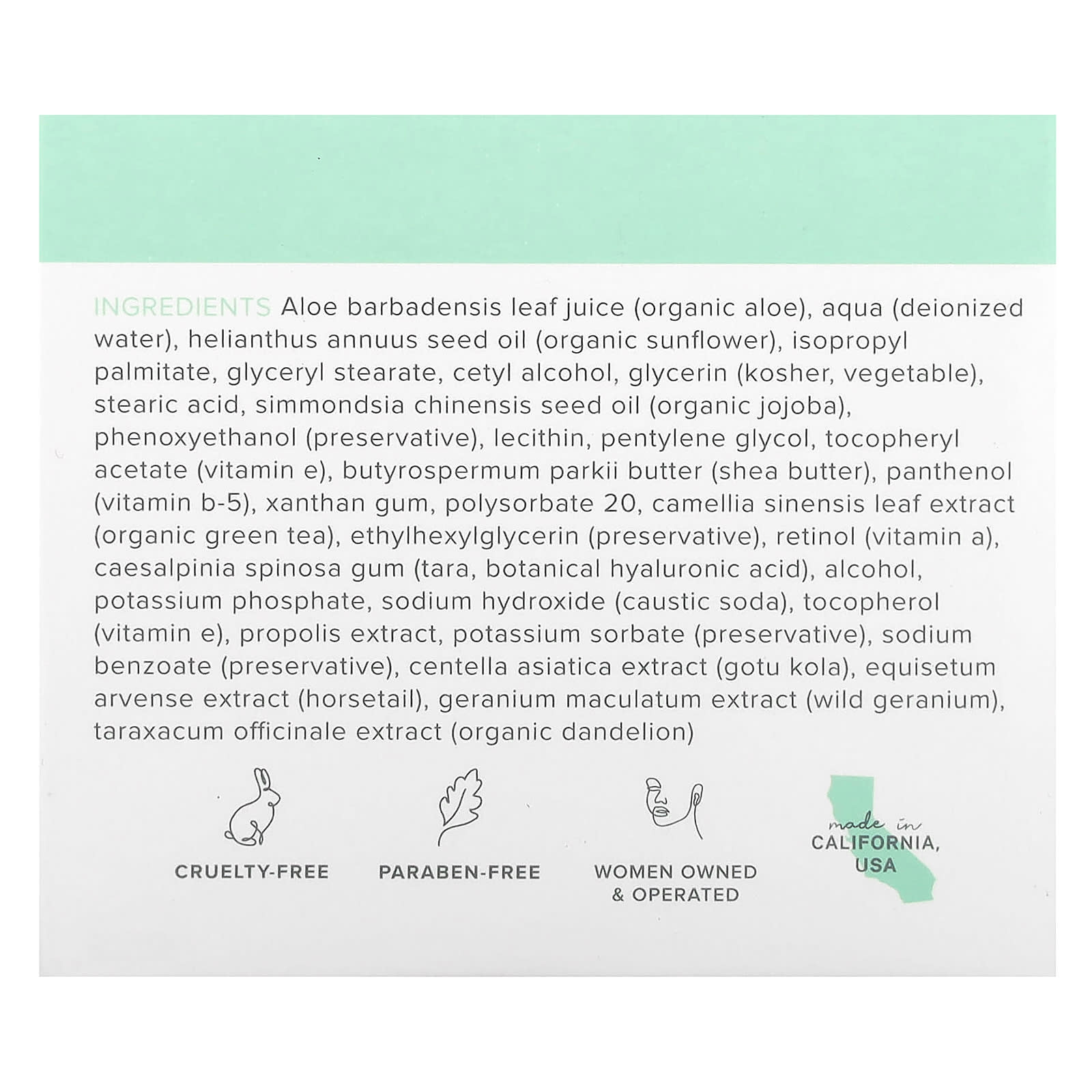 Suco da folha de Aloe barbadensis (aloe orgânica), aqua (água deionizada), óleo da semente de Helianthus annuus (girassol orgânico), palmitato de isopropila, monoestearato de glicerila, álcool cetílico, glicerina (kosher, vegetal), ácido esteárico, óleo da semente de Simmondsia chinensis (jojoba orgânica), fenoxietanol (conservante), lecitina, pentilenoglicol, acetato de racealfatocoferol (vitamina E), manteiga de Butyrospermum parkii (manteiga de karité), pantenol (vitamina B-5), goma xantana, polissorbato 20, extrato da folha de Camellia sinensis (chá verde orgânico), ethylhexylglycerin (conservante), retinol (vitamina A), goma de Caesalpinia spinosa (tara, ácido hialurônico botânico), álcool, fosfato de potássio, hidróxido de sódio (soda cáustica), tocoferol (vitamina E), extrato de própolis, sorbato de potássio (conservante), benzoato de sódio (conservante), extrato de Centella asiatica (gotu kola), extrato de Equisetum arvense (cavalinha), extrato de Geranium maculatum (gerânio selvagem), extrato de Taraxacum officinale (dente-de-leão orgânico).