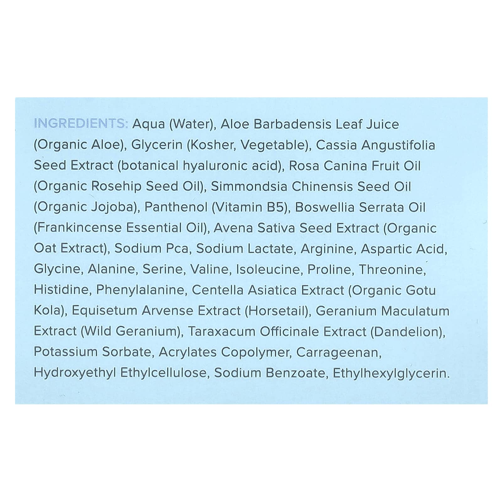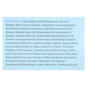 Aqua (água), Suco da folha de Aloe barbadensis (aloe orgânica), glicerina (kosher, vegetal), extrato da semente de Cassia angustifolia (ácido hialurônico botânico), óleo da fruta de Rosa canina (óleo da semente de rosa-mosqueta orgânica), óleo da semente de Simmondsia chinensis (jojoba orgânica), pantenol (vitamina B5), óleo de Boswellia serrata (óleo essencial de olíbano), extrato da semente de Avena sativa (extrato de aveia orgânica), pidolato de sódio, lactato de sódio, arginina, ácido aspártico, glicina, alanina, serina, levovalina, isoleucina, prolina, treonina, histidina, fenilalanina, extrato de Centella asiatica (gotu kola orgânico), extrato de Equisetum arvense (cavalinha), extrato de Geranium maculatum (gerânio selvagem), extrato de Taraxacum officinale (dente-de-leão), sorbato de potássio, acrylates copolymer, carragenina, hydroxyethyl ethylcellulose, benzoato de sódio, ethylhexylglycerin.