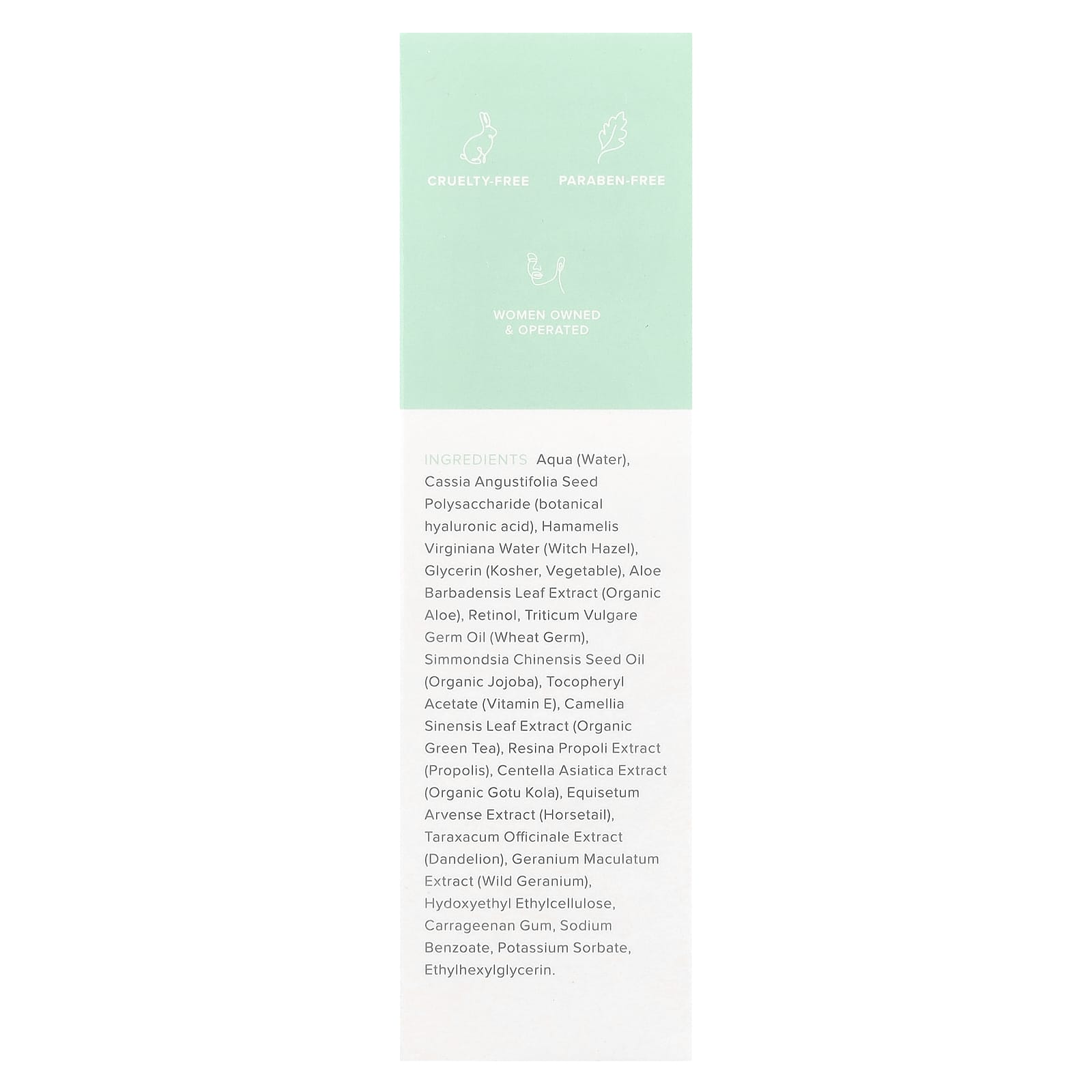 Água, polissacarídeo da semente de Cassia angustifolia (ácido hialurônico botânico), água de Hamamelis virginiana (hamamélis), glicerina (kosher, vegetal), extrato da folha de Aloe barbadensis (aloe orgânica), retinol, óleo do germe de Triticum vulgare (germe de trigo), óleo da semente de Simmondsia chinensis (jojoba orgânica), acetato de racealfatocoferol (vitamina E), extrato da folha de Camellia sinensis (chá verde orgânico), extrato de Resina propoli (prpolis), extrato de Centella asiatica (gotu kola orgânico), extrato de Equisetum arvense (cavalinha), extrato de Taraxacum officinale (dente-de-leão), extrato de Geranium maculatum (gerânio selvagem), hidroxietiletilcelulose, goma carragenina, benzoato de sódio, sorbato de potássio, ethylhexylglycerin.