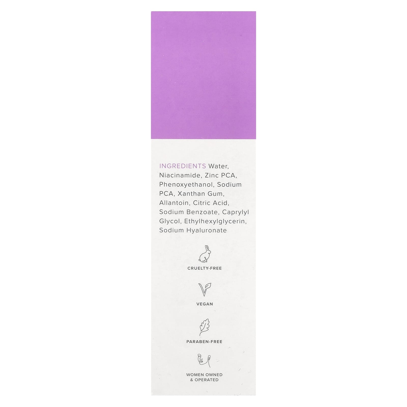 Água, nicotinamida, zinco pca, fenoxietanol, pidolato de sódio, goma xantana, alantoína, ácido cítrico, benzoato de sódio, caprylyl glycol, ethylhexylglycerin, hialuronato de sódio.