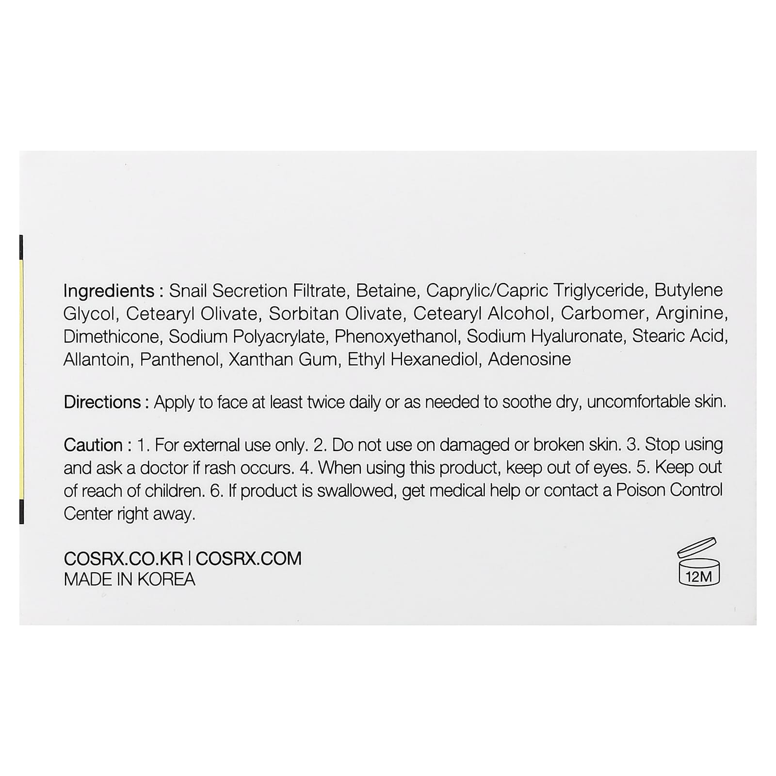Secreção filtrada de caracol, betaína, caprylic/capric triglyceride, butilenoglicol, cetearyl olivate, sorbitan olivate, álcool cetoestearílico, carbômero, arginina, dimeticona, sodium polyacrylate, fenoxietanol, hialuronato de sódio, ácido esteárico, alantoína, pantenol, goma xantana, ethyl hexanediol, adenosina.