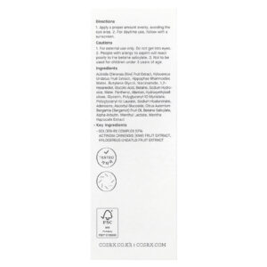 Extrato da fruta de Actinidia chinensis (kiwi), extrato da fruta de Hylocereus undatus, água de Hippophae rhamnoides, butilenoglicol, nicotinamida, 1,2-hexanediol, ácido glicólico, betaína, hidróxido de sódio, água, pantenol, alantoína, hietelose, glicerina, polyglyceryl-10 myristate, polyglyceryl-10 laurate, hialuronato de sódio, adenosina, ascorbyl glucoside, óleo da fruta de Citrus aurantium bergamia (bergamota), salicilato de betaína, alpha-arbutin, menthyl lactate, extrato de Mentha haplocalix.