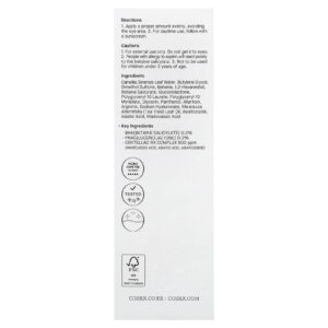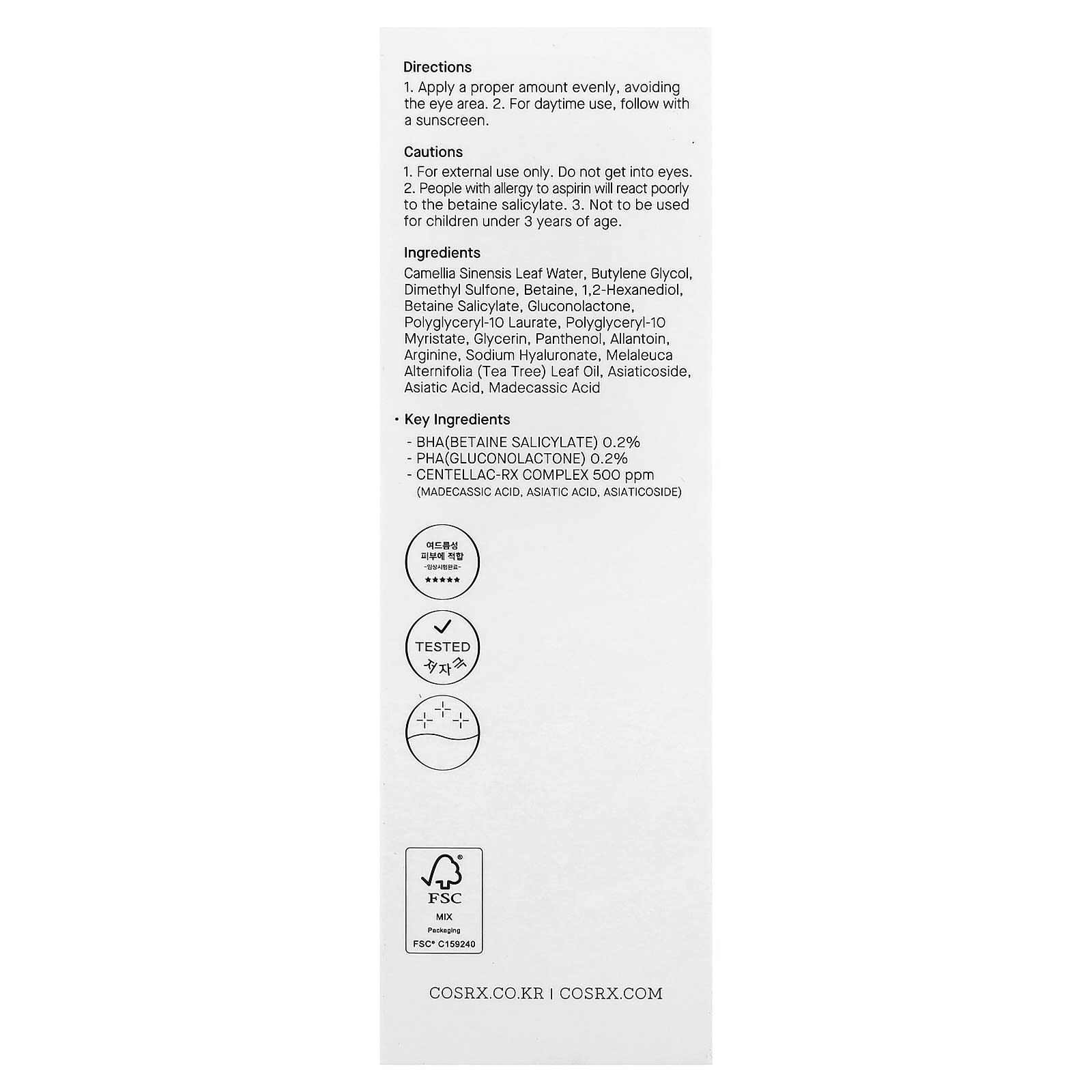 Água da folha de Camellia sinensis, butilenoglicol, dimetilsulfona, betaína, 1,2-hexanediol, salicilato de betaína, gluconolactone, polyglyceryl-10 laurate, poligliceril-10, miristato, glicerina, pantenol, alantoína, arginina, hialuronato de sódio, óleo da folha de Melaleuca alternifolia (melaleuca), asiaticosídeo, asiatic acid, ácido madecássico.