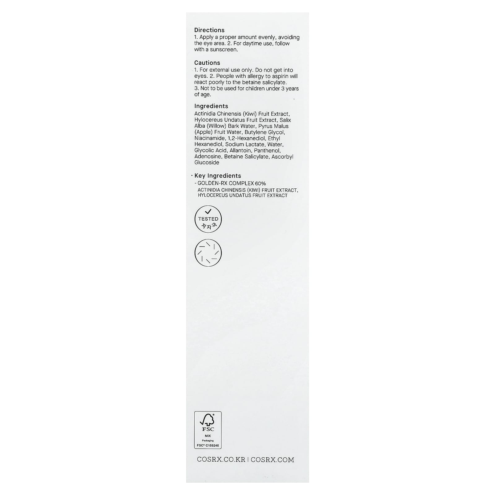 Extrato da fruta de Actinidia chinensis (kiwi), extrato da fruta de Hylocereus undatus, água da casca de Salix alba (salgueiro), água da fruta Pyrus malus (maçã), butilenoglicol, Niacinamida, 1,2-hexanodiol, ethyl hexanediol, lactato de sódio, Água, ácido glicólico, alantoína, pantenol, adenosina, salicilato de betaína, ascorbyl glucoside.