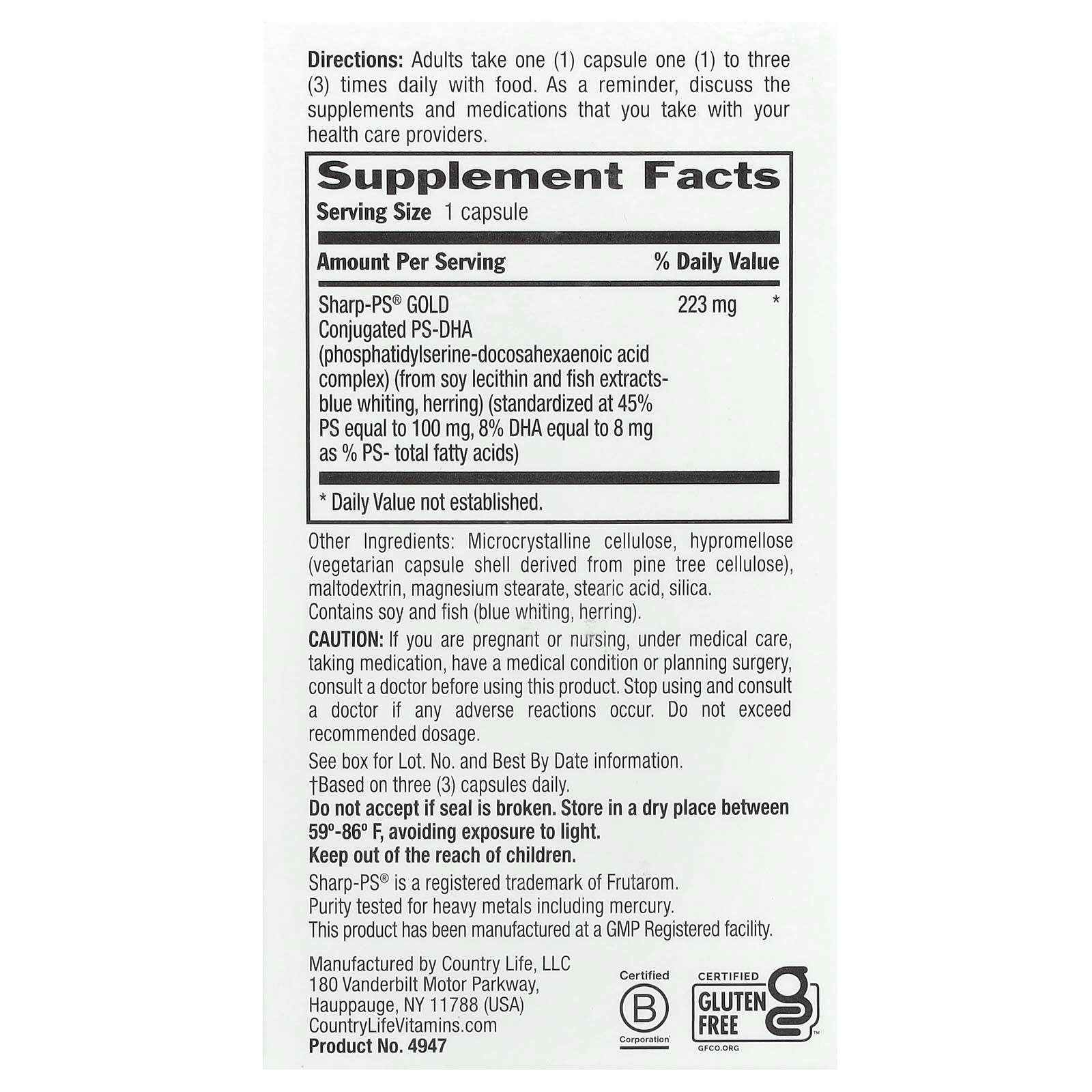 Conjugado com FS-DHA (complexo de fosfatidilserina-ácido docosahexaenoico) (de lecitina de soja e extratos de peixe: verdilhão, arenque) (padronizado a 45% de FS equivalente a 100 mg, 8% de DHA igual a 8 mg como % de FS — ácidos graxos totais)