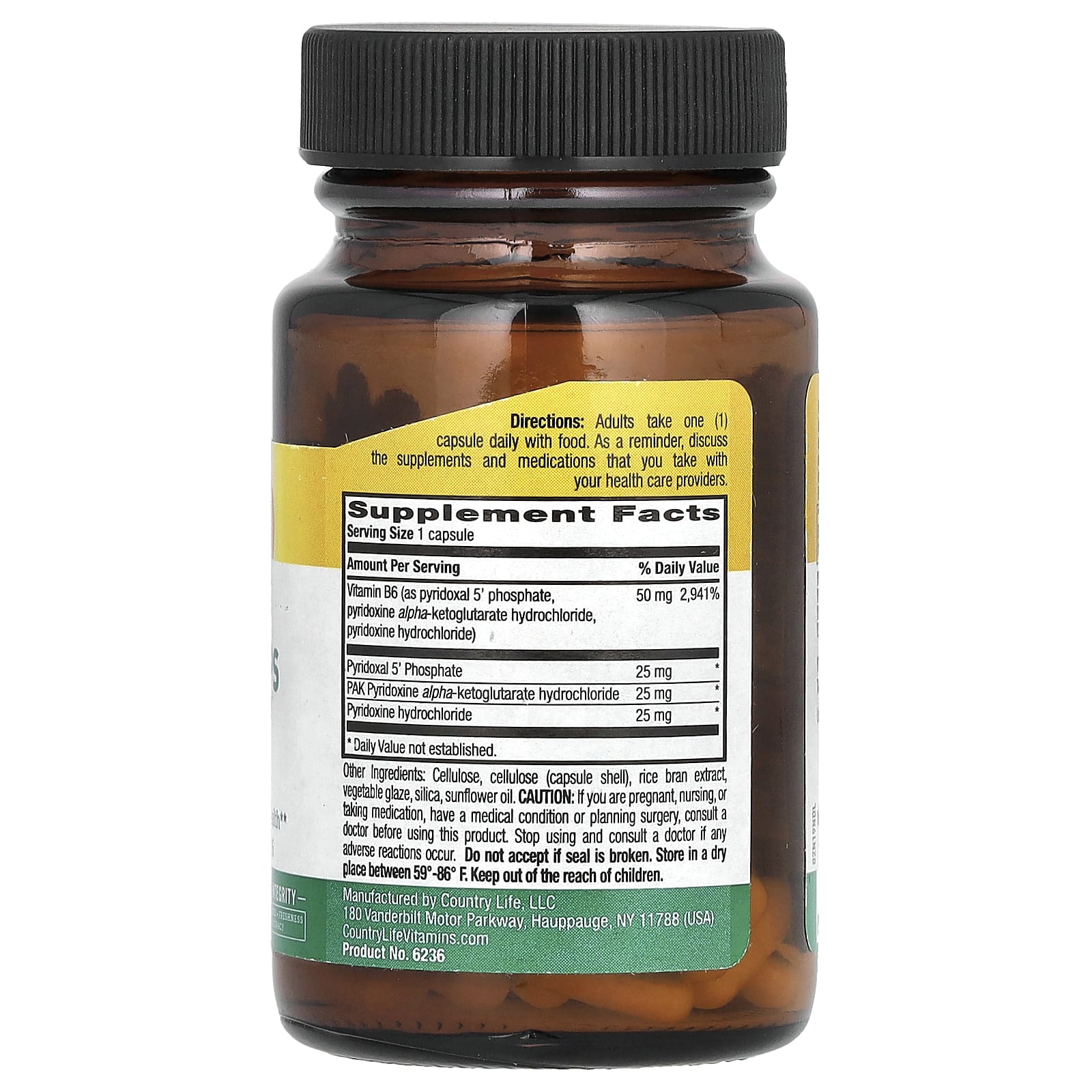 Country Life Cápsulas B6 Ativas de Coenzima P-5-P / PAK 30 Cápsulas Veganas – Country Life Suplementos Vitaminas Vitamina B Vitamina B6 (Piridoxina).