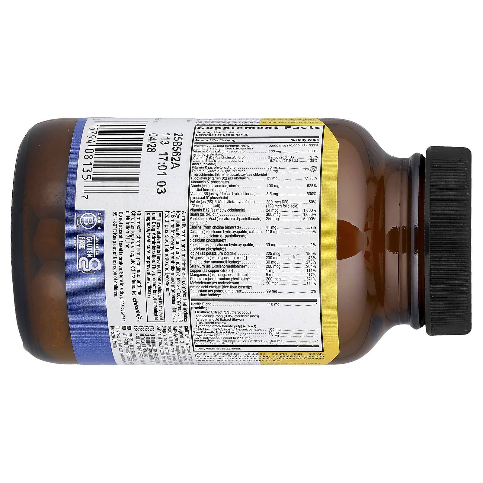 Um complexo multivitamínico e multimineral que inclui nutrientes essenciais para a saúde masculina, como Vitaminas B “coenzimadas” para o metabolismo energético e magnésio para a saúde do coração, além de Saw Palmetto e Licopeno.