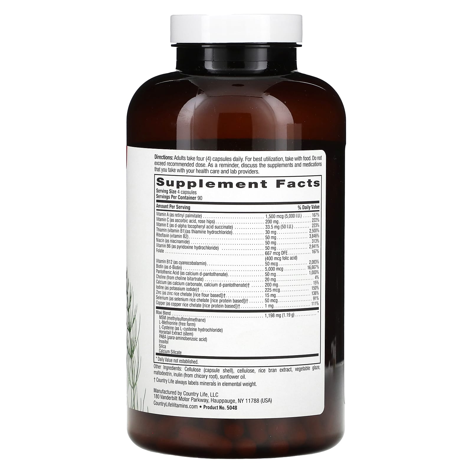 Country Life Maxi-Hair Plus 360 Cápsulas Vegetarianas – Country Life Suplementos Cabelos, Pele e Unhas Fórmulas para cabelos, pele e unhas.