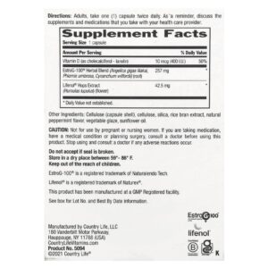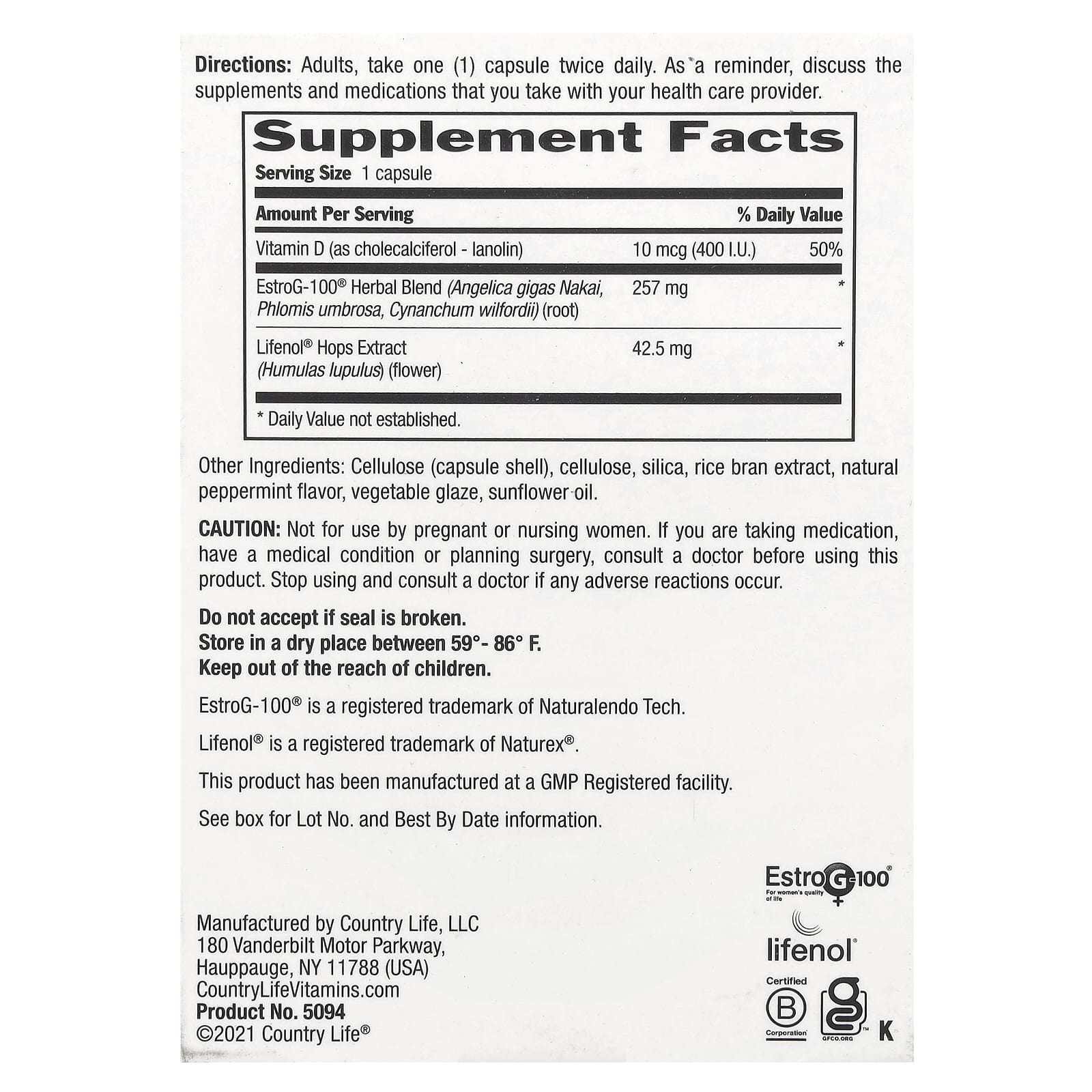 A fórmula segura para a menopausa da Country Life com ingredientes clinicamente testados fornece tratamento completo para os principais sintomas da menopausa. EstroG-100® é um extrato da raiz botânica padronizado que ajuda a reduzir os sintomas associados à menopausa, enquanto o extrato da flor de lúpulo Lifenol® melhora a qualidade de vida em mulheres na menopausa.