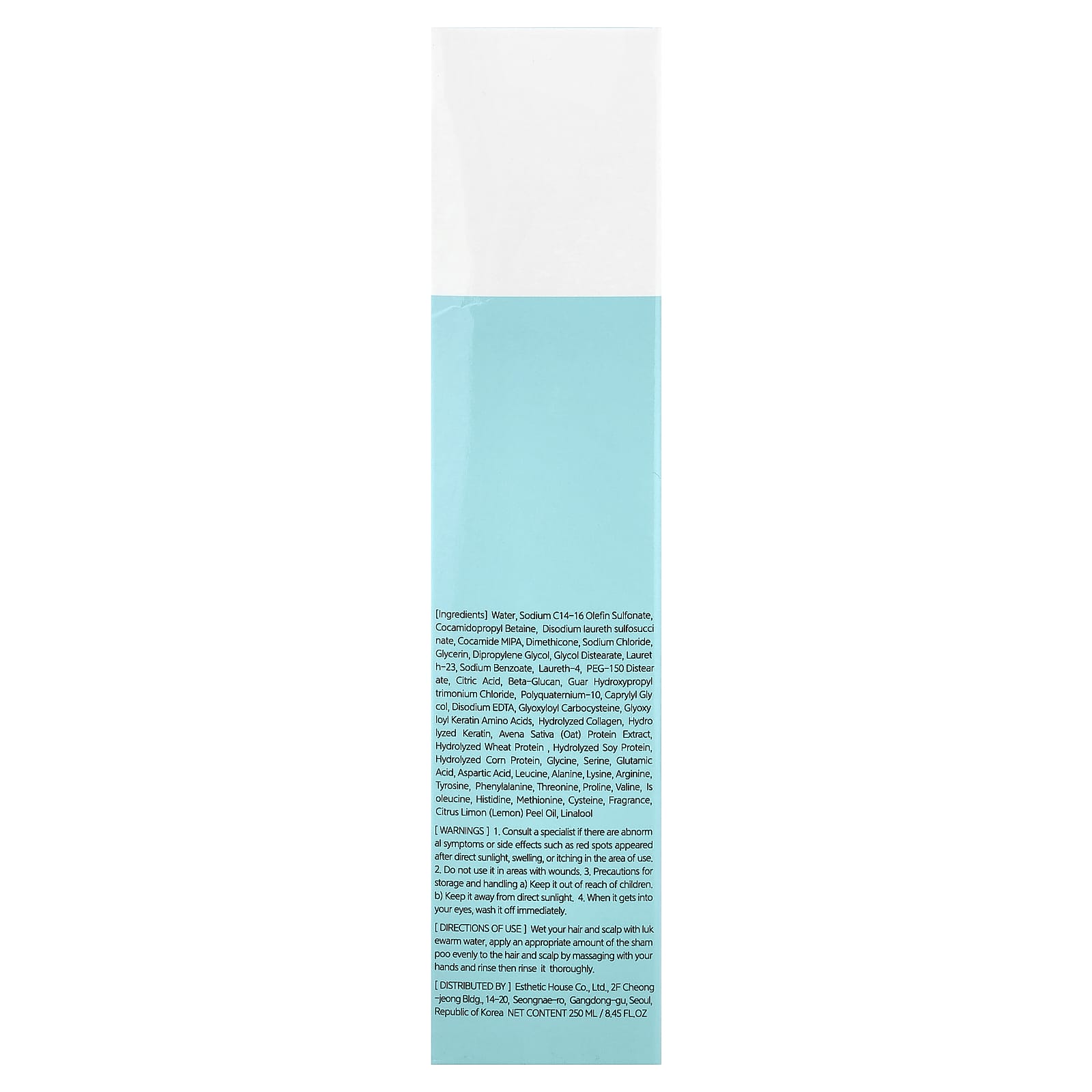 Água, sodium C14-16 olefin sulfonate, cocoamidopropil betaína, disodium laureth sulfosuccinate, cocamide mipa, dimeticona, cloreto de sódio, Glicerina, dipropilenoglicol, diestearato de etilenoglicol, laureth-23, benzoato de sódio, laureth-4, peg-150 distearate, ácido cítrico, betaglucano, cloreto de guar hydroxypropyl trimonium, Poliquatérnio-10, caprilil glicol, EDTA dissódico, glioxiloilcarbocisteína, aminoácidos de queratina de glioxiloil, colágeno hidrolisado, colágeno hidrolisado, extrato proteico de Avena sativa (aveia), proteína de trigo hidrolisada , Proteína de soja hidrolisada, proteína de milho hidrolisada, glicina, serina, ácido glutâmico, ácido aspártico, leucina, alanina, lisina, arginina, tirosina, fenilalanina, treonina, prolina, valina, isoleucina, histidina, metionina, cisteína, fragrância, Óleo de casca de limão cítrico, linalol.