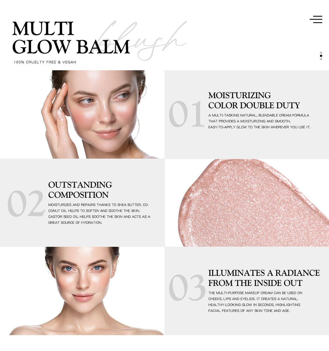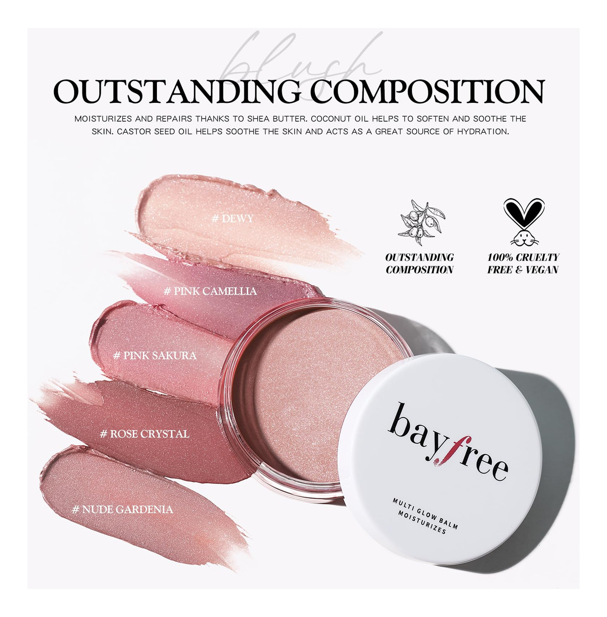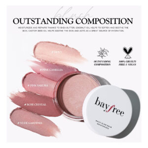 Um bálsamo de brilho facial colorido com uma textura suave e hidratante, com ampla variedade de usos e fácil de aplicar. O bálsamo de blush em creme pode ser usado nas bochechas, lábios ou em qualquer área que precise ser tingida ou realçada para uma atualização instantânea. Disponível em cinco cores para se adequar a qualquer tom de pele e ocasião. Dicas: o blush em creme sem baía se concentra em criar um efeito hidratado e úmido, então esse blush tem uma cor mais clara do que os blushes normais. Se você quiser brilho e cor, você pode colocá-lo em camadas com um tom mais escuro. Nosso blush é montável. – COR HIDRATANTE DE DUPLA FUNÇÃO Uma fórmula de creme multitarefa natural e misturável que fornece um brilho hidratante, suave e fácil de aplicar na pele, onde quer que você a use. – ILUMINA UM BRILHO DE DENTRO PARA FORA. O creme de maquiagem multiuso pode ser usado nas bochechas, lábios e pálpebras. Ele cria um brilho natural e saudável em segundos, destacando as características faciais de qualquer tom de pele e idade. – Excelente composição Hidrata e repara graças à manteiga de karité. O óleo de coco ajuda a suavizar e acalmar a pele. O óleo de mamona ajuda a acalmar a pele e atua como uma ótima fonte de hidratação. – Misturável e edificável Aplique suavemente com os dedos ou pincel e repita nos lábios ou bochechas para obter uma cor mais intensa. O blush para as bochechas ou a cor dos lábios parecem mais naturais. – Fórmula segura Todos os produtos Bayfree são formulados com uma fórmula que não agride a pele e não foram testados em animais. Glow Balm é o segredo de uma aparência pura.