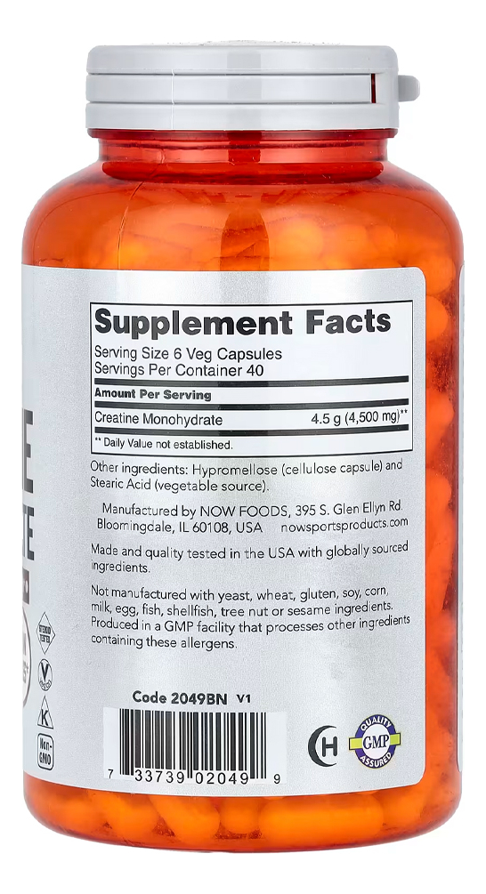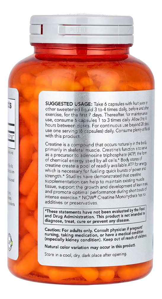 Cada cápsula contém creatina monohidratada pura, conhecida por sua eficácia e segurança. A fórmula de Now Foods é cuidadosamente elaborada para garantir um produto confiável, oferecendo uma maneira eficaz de suplementar sua dieta com creatina. Validade longa