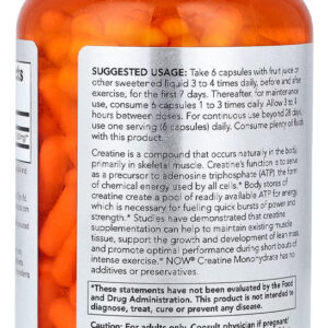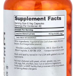 Cada cápsula contém creatina monohidratada pura, conhecida por sua eficácia e segurança. A fórmula de Now Foods é cuidadosamente elaborada para garantir um produto confiável, oferecendo uma maneira eficaz de suplementar sua dieta com creatina. Validade longa