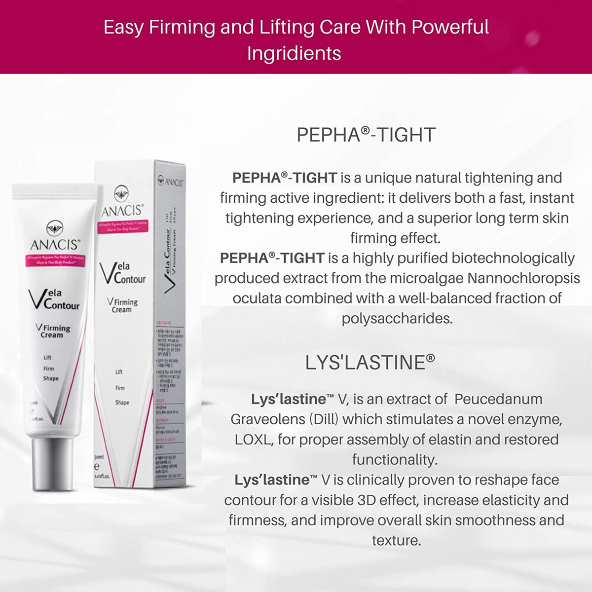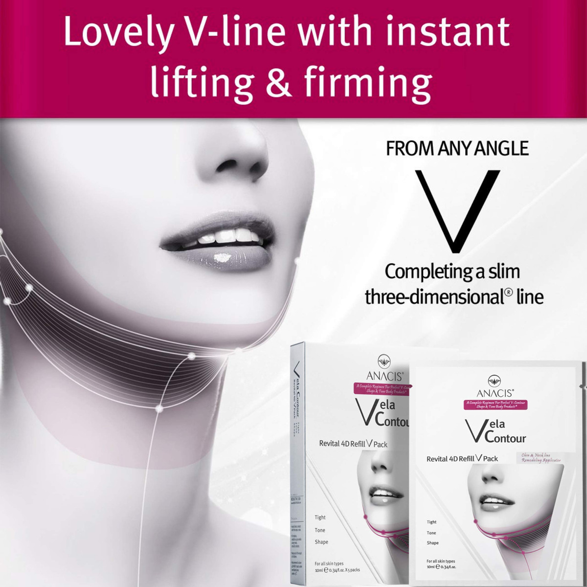 Você pode ser tão bonita por fora quanto por dentro, graças aos cuidados antienvelhecimento da Anacis Vela Contour. Este creme dinâmico atua como um removedor de queixo duplo, mas não para por aí. Se você tem um rosto bonito e jovem, não deixe que a pele flácida ao redor da mandíbula o sobrecarregue e prejudique sua vida social. Esqueça os cremes hidratantes simples que são pesados, gordurosos e não condicionam a pele. Use o leve Creme Firmador Vela Contour V da Anacis para esculpir sua pele com sua fórmula firmadora de pescoço. Recupere um contorno limpo ao longo da linha da mandíbula e um formato de rosto aprimorado graças à maior firmeza que você experimenta em cada aplicação. Aproveite esta oportunidade para recuperar a suavidade e a textura com este creme de ação rápida. Você pode remodelar o contorno do seu rosto para obter um efeito 3D perceptível. – Aproveite esta oportunidade para recuperar a suavidade e a textura com este creme de ação rápida. Você pode remodelar o contorno do seu rosto para obter um efeito 3D perceptível.