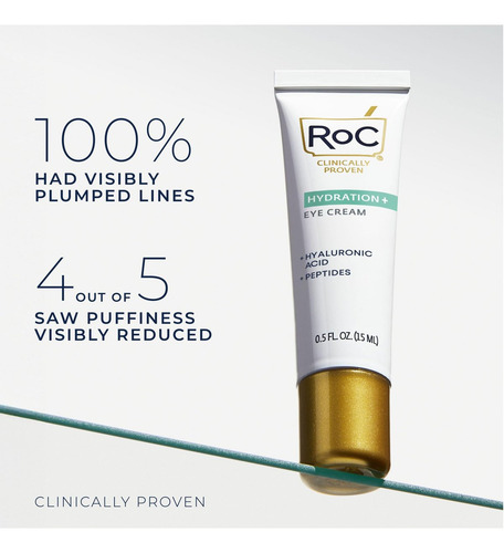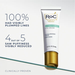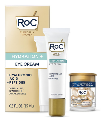Creme antienvelhecimento de ácido hialurônico RoC Multi Correxion para inchaço e olheiras (0,5 onças) + cápsulas de retinol RoC (7 unidades), rotina de cuidados com a pele, sem fragrâncias e sem parabenos, para mulheres e homens Inovação em cuidados com a pele: nossos produtos são reconhecidos por líderes do setor de beleza e dermatologistas por sua eficácia superior. Continuamos pesquisando e inovando novas fórmulas para uma pele com aparência mais saudável. Creme para os olhos com ácido hialurônico: com o tempo, os níveis naturais de ácido hialurônico diminuem, fazendo com que a pele fina ao redor dos olhos pareça enrugada e cansada. O creme para olhos com ácido hialurônico clinicamente comprovado da RoC reabastece essa área delicada, oferecendo três resultados antienvelhecimento: 1) Elevação: os peptídeos apertam e definem visivelmente o contorno dos olhos. 2) Suavização: 1,5% de ácido hialurônico preenche as linhas finas. 3) Despertar: a cafeína reduz o inchaço e rejuvenesce a área com o tempo. Resultados comprovados para mulheres e homens: em 1 semana, 100% notaram uma redução visível nos pés de galinha e na pele hidratada; em 4 semanas, 85% viram menos inchaço sob os olhos; em 8 semanas, 88% viram uma pele mais firme e 85% viram uma redução nas olheiras. Testado por dermatologista e oftalmologista. Sem fragrância e parabenos. Fórmulas antienvelhecimento: se você