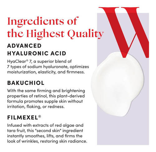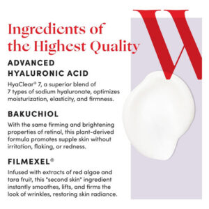 Contém ingredientes antienvelhecimento poderosos, como HyaClear 7 e Bakuchiol, que melhoram a firmeza e o brilho sem irritar a pele.