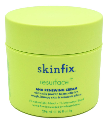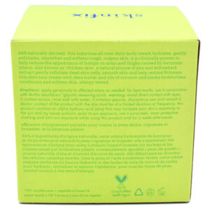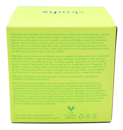 Creme corporal renovador Skinfix Resurface+ AHA 10 onças/296 ml Um luxuoso creme corporal vegano diário que hidrata, esfolia suavemente, suaviza e suaviza a pele áspera, irregular e cremosa. Ativos: – Mistura natural de AHA de 5%: esfolia suavemente as células mortas da pele – Extrato de limão de 1%: um esfoliante natural suave da AHA Como usar: – Use diariamente um creme para todo o corpo para hidratar profundamente e estimular suavemente a esfoliação natural da pele. Também é eficaz como tratamento específico para peles secas, ásperas, esburacadas ou crepadas de todo o corpo. Para obter melhores resultados, use em conjunto com Esfoliante renovador glicólico Skinfix Resurface+ (vendido separadamente) Este produto é vegano e livre de crueldade. É livre de fragrâncias, parabenos, sulfatos, formaldeído, ftalatos, silicones, lanolina, petrolato, propilenoglicol, PEGs, glúten e muito mais. – LUXUOSO: é um creme corporal vegano completo que hidrata, esfolia suavemente, suaviza e suaviza a pele áspera, irregular e cremosa. – 95 por cento NATURAL: Está clinicamente comprovado que este creme de origem natural de 94 por cento ajuda a reduzir a aparência de inchaços nos braços e coxas causados pela queratose pilar, também conhecida como pele de frango. ‘ O AHA e o extrato de casca de salgueiro esfoliam suavemente e suavizam a pele. Ele suporta firmeza e elasticidade naturais. – ATIVOS PODEROSOS: tem 5% de mistura natural de AHA que esfolia suavemente as células mortas da pele. Também contém 1% de extrato de limão, que é um esfoliante natural suave da AHA. – TESTADO E RECOMENDADO: em um estudo clínico de 2 semanas conduzido por um dermatologista, o creme renovador Resurface+ AHA mostrou uma melhora estatisticamente significativa nas inchações/ceratose pilar, escamação e rugosidade da pele, conforme avaliado por um dermatologista especializado. – FÓRMULA TRANQUILA: este creme corporal é vegano e livre de crueldade. É isento de fragrâncias, parabenos, sulfatos, formaldeído, ftalatos, silicones, lanolina, petrolato, propilenoglicol, PEGs, glúten e muito mais. – Tipo de pele: sensível