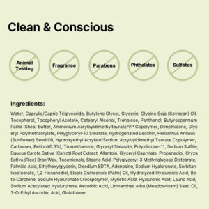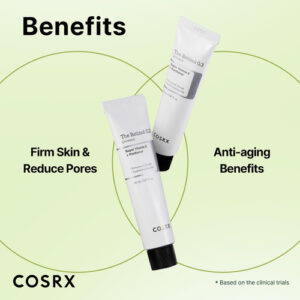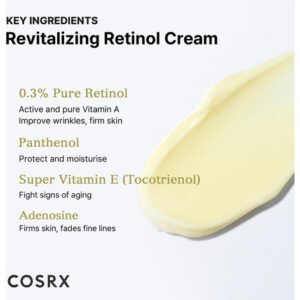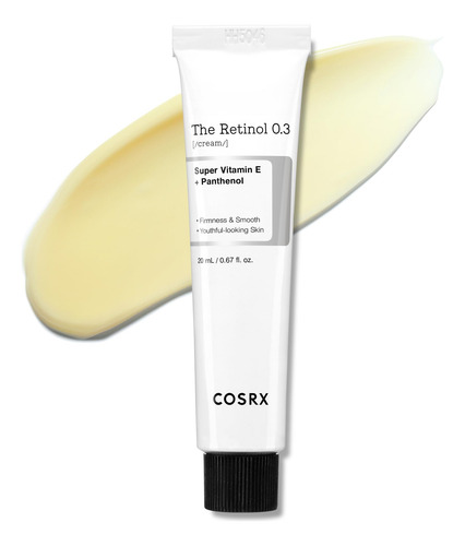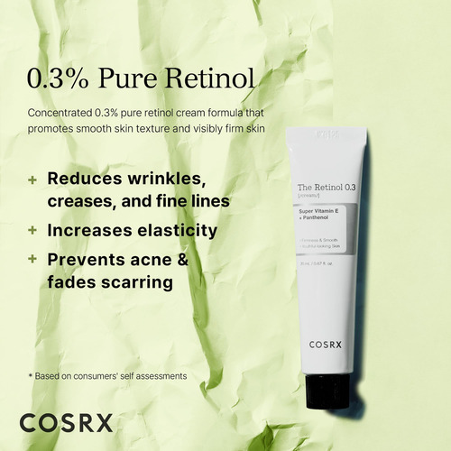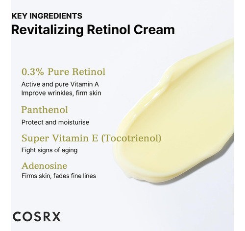 Creme de retinol 0,3%: o retinol ajuda a reduzir os sinais de envelhecimento, como linhas finas e rugas, para obter uma pele mais lisa, firme e com aparência mais jovem. Ajuda a renovar e revigorar a pele e deixa o rosto brilhante com brilho. – Creme de retinol 0,3%: o retinol ajuda a reduzir os sinais de envelhecimento, como linhas finas e rugas, para obter uma pele mais lisa, firme e com aparência mais jovem. Ajuda a renovar e revigorar a pele e deixa o rosto radiante. – Principais benefícios: Com base nos resultados reais das autoavaliações dos consumidores, o creme Retinol 0,3% ajuda a reduzir rugas, vincos e linhas finas enquanto aumenta a elasticidade da pele, previne a acne e o desbotamento das cicatrizes. – Ingredientes dermatológicos: o retinol é uma forma de vitamina A ativa e pura que ajuda a melhorar as rugas e a firmar a pele. 1% de pantenol ajuda a proteger e hidratar a pele. A supervitamina E (tocotrienol) ajuda a combater os sinais de envelhecimento. A adenosina firma a pele e atenua as linhas finas. – Como usar: aplique uma quantidade do tamanho de uma ervilha como última etapa do cuidado com a pele. Para uso diurno, continue com protetor solar SPF 30+. * Faça um teste de contato no corpo antes de usar no rosto. – Padrões COSRX: Padrões COSRX: Todos os produtos COSRX são formulados com ingredientes amigáveis à pele que aliviam a pele irritada. Hipoalergênico, testado dermatologicamente, sem testes em animais, sem parabenos, sem sulfatos, sem ftalatos