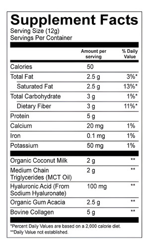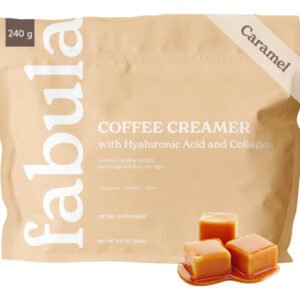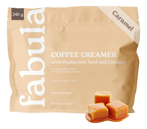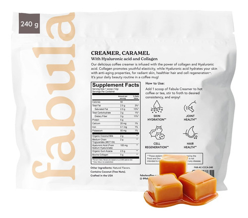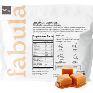 nutritivos: cada porção do Fabula Collagen Creamer fornece 200 mg de ácido hialurônico, 5 g de colágeno puro, 2 g de óleo MCT e 2 g de leite de coco orgânico. Esses ingredientes apoiam a hidratação da pele, a saúde das articulações, aumentam a energia e o metabolismo e fornecem gorduras saudáveis, transformando seu café em uma bebida