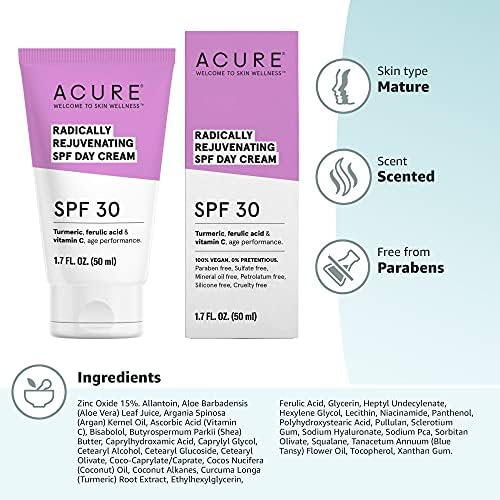 ACURE Creme de Dia Radicalmente Rejuvenescedor FPS 30 | 100% Vegano | Fornece suporte anti-envelhecimento | Cúrcuma, Ácido Ferúlico e Vitamina C – Fornece Proteção Solar e Antioxidantes | 1,7 fl onças