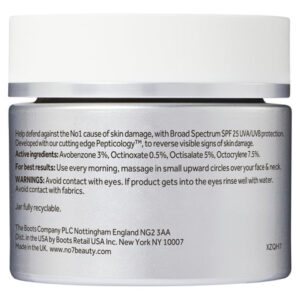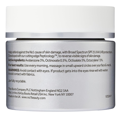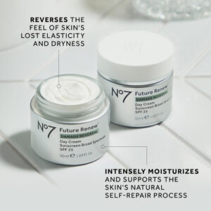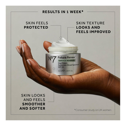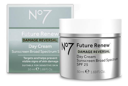 Está comprovado que o hidratante facial Future Renew Damage Reversal da No7 com SPF protege contra os raios UV e reverte os sinais visíveis de danos à pele, como sensação de ressecamento e perda de elasticidade. Desenvolvida pela Pepticology, a nova tecnologia de peptídeos com patente pendente da No7, desenvolvida ao longo de 15 anos por cientistas líderes mundiais. Ao contrário dos cuidados antienvelhecimento típicos da pele, este creme hidratante tem uma textura leve que é facilmente absorvida pela pele e, ao mesmo tempo, funciona bem sob a maquiagem. Use este hidratante antienvelhecimento para rosto e pescoço todas as manhãs, aplicando-o na pele recém-limpa. Ele funciona como um creme anti-rugas para reverter a sensação de perda de elasticidade e ressecamento da pele para um brilho juvenil. Para obter melhores resultados, use este creme facial para mulheres com toda a nossa coleção de cuidados para a pele No7 Future Renew. – Controle de danos para sua pele – Você sabia que os raios UV do sol são a causa #1 do envelhecimento acelerado da pele e podem causar sinais visíveis de danos causados pelo sol? O creme firmador Future Renew da No7 ajuda a reverter esses sinais, ao mesmo tempo em que restaura a umidade da pele para um brilho jovem e saudável. – Revive a pele envelhecida – Ao contrário dos cremes e hidratantes faciais comuns, este hidratante antienvelhecimento com SPF contém a nova tecnologia peptídica pendente da No7 para apoiar o processo de autorreparação da pele. – Sem capa branca – A textura leve desse creme facial reafirmante derrete entra perfeitamente na pele e funciona bem sob a maquiagem. Esta formulação é aprovada por dermatologistas e contém tecnologia desenvolvida por cientistas líderes mundiais. – Como usar – Massageie o hidratante facial em pequenos círculos ascendentes sobre o rosto e pescoço todas as manhãs. Para obter melhores resultados, use com o restante da linha No7 Future Renew. – Empoderando mulheres desde 1935 – A No7 vem criando uma história de beleza ajudando as mulheres a terem a melhor aparência e a se sentirem melhor por décadas. Com nossa rica herança de saúde e beleza, cuidados com a pele inovadores e maquiagem apoiados pela ciência, nos tornamos uma marca confiável ao longo das gerações. O No7 sempre ofereceu a todas as mulheres uma beleza luxuosa e glamorosa a um preço que elas podem pagar.