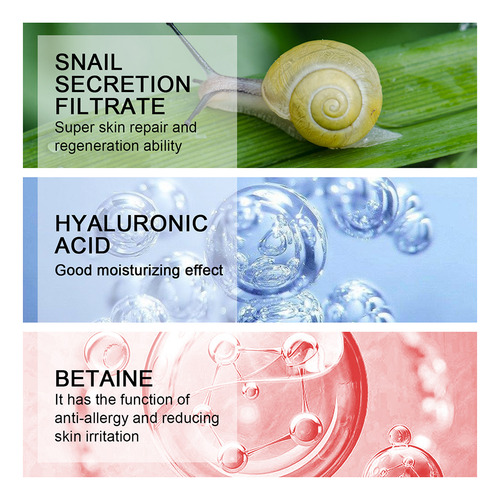 Rico em ácido hialurônico, filtrado de secreção de caracol, betaína e outros ingredientes naturais, é suave, saudável e seguro, adequado para peles sensíveis, secas, oleosas e mistas. 2.