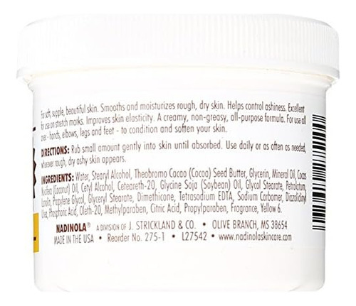 Nadinola Creme de Manteiga de Cacau, melhora a elasticidade da pele. Uma fórmula cremosa, não gordurosa e multiuso, para uso em mãos, cotovelos, pernas e pés. Uma fórmula cremosa, não gordurosa e multiuso. Color: Marca: Nadinola Dimensiones: 0.07 x 0.07 x 0.06mts. Peso del Producto: 0.14 Kilogramos. Peso de Envio: 0.14 Kilogramos. Modelo: STRICKLAND Garantia do vendedor: 30 dias