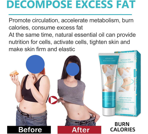 • ?Queimador de gordura?Nosso creme de emagrecimento é um queimador de gordura para o abdômen e cintura. Aquece partes do corpo, facilitando a transpiração para perda de peso. Ajuda a apertar, tonificar e lubrificar os músculos abdominais.
