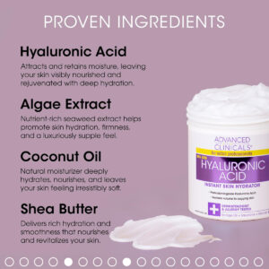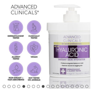 Creme hidratante facial e corporal com ácido hialurônico da Advanced Clinicals O hidratante instantâneo para a pele com ácido hialurônico da Advanced Clinicals é formulado para restaurar o volume da pele flácida e, ao mesmo tempo, reter a umidade para uma aparência mais jovem. O ácido hialurônico é um umectante, que é uma palavra chique para um ingrediente que ajuda a reter a umidade. Aprimorados com óleo de borragem, esqualeno e vitamina E, esses ingredientes benéficos contêm propriedades restauradoras que realmente transformam sua pele. Aumente a retenção de água na pele para reduzir a aparência de rugas e linhas finas para uma tez impecável. Creme hidratante para rosto e corpo Advanced Clinicals Retinol Combata os sinais de envelhecimento com esta poderosa fórmula de retinol da Advanced Clinicals. Este hidratante antirrugas diminuirá drasticamente os sinais de envelhecimento para um brilho incrivelmente jovem. Com o tempo, todos começarão a desenvolver uma aparência envelhecida a partir dos seguintes sinais: rugas profundas, linhas finas, olheiras, danos causados pelo sol e hiperpigmentação. Esta fórmula avançada contém poderosos elementos nutritivos que retêm a umidade para evitar perdas futuras, para que você possa exibir uma aparência mais jovem com uma pele mais firme e volumosa. Aloe Vera, chá verde e outros nutrientes ajudarão seu rosto e corpo a se sentirem firmes, jovens e renovados. Se você não estiver satisfeito com sua compra, entre em contato com a Advanced Clinicals para obter um reembolso sem perguntas. Instruções: Aplique uma quantidade suficiente de loção no rosto, pescoço e mãos limpos. Massageie suavemente na pele usando movimentos circulares ascendentes, prestando especial atenção às rugas, até que seja totalmente absorvido. Use diariamente. – #1 INGREDIENTE ANTIENVELHECIMENTO CLINICAMENTE COMPROVADO A vitamina A (retinol) é considerada o #1 ingrediente antienvelhecimento recomendado por dermatologistas para cuidados com a pele. É conhecido por diminuir a aparência de rugas profundas, flacidez da pele, linhas finas, pele cremosa e danos causados pelo sol, ao mesmo tempo que aumenta a produção de colágeno para ajudar na firmeza. Formulado pela primeira vez para uso após procedimentos cosméticos, este creme de retinol agora está disponível para quem deseja renovar sua pele. – O creme hidratante e nutritivo de retinol da Advanced Clinicals é infundido com Aloe Vera, camomila, glicerina e chá verde, que trabalham juntos para firmar a pele com eficácia e reduzir a aparência de pele danificada pelo sol, rugas, linhas finas e pele cremosa. Aloe Vera protege contra vermelhidão e irritação visíveis. Chá verde e camomila protegem contra danos ambientais e reduzem o inchaço. A combinação de ingredientes torna este creme corporal de retinol não irritante, ao contrário de muitos outros produtos de retinol. – CREME DE ÁCIDO HIALURÔNICO O ácido hialurônico é uma substância natural encontrada em nossa pele que ajuda a mantê-la hidratada e gorda. À medida que envelhecemos, a quantidade de ácido hialurônico em nossa pele diminui, levando a uma perda de firmeza e elasticidade. O ácido hialurônico é um umectante, o que significa que atrai água para a pele + ajuda a manter a pele hidratada para evitar ressecamento e escamação. O ácido hialurônico também pode ajudar a melhorar a textura e o tom da pele, proporcionando uma tez mais radiante e jovem. – HIDRATAÇÃO PROFUNDA DA PELE – O ácido hialurônico pode ajudar a reduzir a aparência de linhas finas, flacidez da pele e rugas, preenchendo e hidratando profundamente a pele, além de restaurar a elasticidade. Este creme de ácido hialurônico da Advanced Clinicals ajuda a hidratar e nutrir a pele, tornando-a mais suave para uma pele mais jovem e saudável. Esta loção corporal de ácido hialurônico levemente perfumada é altamente eficaz contra a redução do aparecimento de envelhecimento prematuro, rugas, pele seca, pele cremosa e muito mais. – HIDRATE, RENOVE E RESTORE Testado por dermatologistas, testado clinicamente e testado contra alergias. Fabricado em nosso laboratório inspecionado pela FDA em Chicago, EUA. Seja qual for o seu tipo de pele, a Advanced Clinicals tem sua solução natural. Restaure um brilho mais jovem à sua pele com o poder do Retinol + Ácido Hialurônico e fórmulas cientificamente comprovadas. Na Advanced Clinicals, temos o compromisso de ajudar você a se sentir confiante em sua pele. Priorizamos sua experiência positiva e a garantimos com soluções comprovadas.