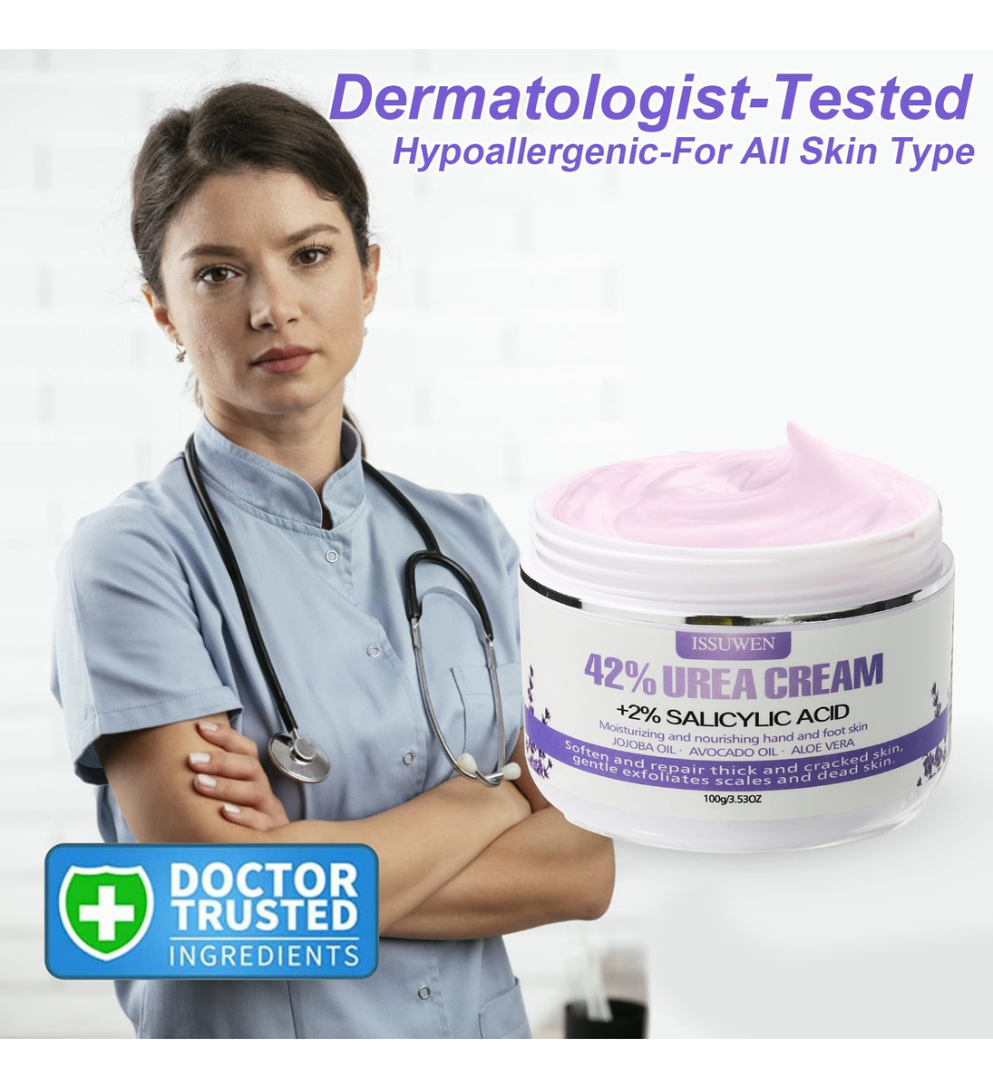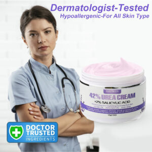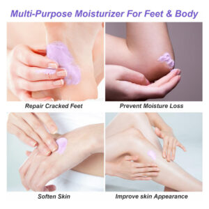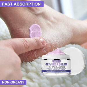 Creme de ureia – Benefícios de experimentar o creme de ureia: Nosso creme de ureia contém 42% de uréia e 2% de ácido salicílico, combinados com ingredientes naturais, como aloe vera, óleo de jojoba, manteiga de karité e muito mais. Este creme para os pés é formulado especificamente para tratar problemas nos pés, fornecendo nutrição, hidratação, suavização e reparação para a pele seca e rachada, aliviando eficazmente a dor. – Dê adeus aos calcanhares rachados: sapatos desconfortáveis, um estilo de vida acelerado e esportes podem deixar seus pés com calcanhares rachados e secos. Nosso creme de uréia para pés oferece a solução mais fácil e rápida. Sua fórmula perfeita hidrata e suaviza profundamente os pés, proporcionando calcanhares incrivelmente macios e aliviando a dor e o incômodo dos calos. Com a adição de essência de lavanda, você também pode desfrutar de uma experiência relaxante e calmante. – Solução para pele testada por dermatologistas: nosso creme para pés testado por dermatologistas para calcanhares secos e rachados atende aos padrões médicos. Ele fornece hidratação e nutrição intensas para a pele seca e rachada das mãos, pés, cotovelos e joelhos. A infusão de lavanda potencializa os benefícios, adicionando um toque calmante e rejuvenescedor. Este creme também esfolia suavemente as manchas ásperas, deixando sua pele renovada, sedosa e delicadamente perfumada com lavanda. – Fórmula não oleosa: experimente as maravilhas do nosso creme de ureia exclusivo, não oleoso, com infusão de lavanda. A solução é absorvida instantaneamente, proporcionando forte hidratação e revitalizando as células opacas da pele. Você terá uma aparência incrível, permitindo que você desfrute de atividades como dançar e correr sem nenhum resíduo de gordura. O aroma sutil de lavanda adiciona uma camada extra de relaxamento e frescor à sua rotina de cuidados com a pele. – Essencial diário para cuidados com a pele: descubra a diferença com o uso consistente de nosso creme de ureia. Em apenas uma semana, você notará uma melhora significativa na condição da sua pele. Depois de duas semanas, os efeitos visíveis serão óbvios e, em três semanas, você desfrutará de uma pele sedosa e hidratada com o elemento calmante adicionado de lavanda. Faça deste creme o seu cuidado diário de pele essencial a longo prazo, atuando como uma loção para
