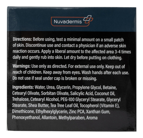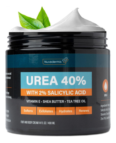 Abra um novo mundo de pés suaves e macios. O creme de ureia tem alguns benefícios importantes para a pele. Hidrata – De acordo com pesquisas, a pele seca pode ser tratada com sucesso com cremes. O creme de ureia Nuvadermis de 40 por cento para pés mantém a pele úmida, retirando água das camadas mais profundas da pele e do ar para suavizar a pele. Esfolia – A ureia é conhecida como agente queratolítico. Ele decompõe a proteína queratina na camada externa da pele, reduzindo o acúmulo de pele morta e eliminando a descamação ou descamação da pele. Melhora a penetração – A ureia também desempenha um papel importante no aumento da permeabilidade de certos ingredientes para cuidados com a pele, funcionando como um veículo para outros ingredientes de desempenho, incentivando-os a penetrar facilmente na pele. Suaviza – Outros ingredientes ativos geralmente são embalados com um componente de uréia. Um dos ingredientes mais potentes é a manteiga de karité, que suaviza e suaviza a pele, diminuindo o inchaço. Fortalece a barreira da pele – A ureia restaura a função de barreira natural da pele, o que melhora a capacidade da pele de reter a umidade e se defender contra irritantes externos. E quanto às condições de pele às quais este creme é direcionado? É comumente usado para tratar: Calos e calos Alguns problemas nas unhas O creme de uréia também é bom para tratar o seguinte: Pele seca, pele com coceira, unhas encravadas, irritação dos pés, pele vermelha, adicione creme de uréia ao carrinho e desfrute dos pés macios do bebê. – Creme de uréia para pele seca e rachada: nosso creme de 40% de uréia é um hidratante tópico potente que oferece hidratação intensa e benefícios suavizantes para peles severamente secas e rachadas. Ideal para tratar calos, calos e manchas ásperas nos pés e em outras áreas. – Loção de calcanhar rachado para pés macios: transforme sua rotina de cuidados com a pele com nossa loção para calcanhar rachado, projetada para curar e suavizar rapidamente calcanhares ásperos e rachados. Essa loção reparadora versátil também faz maravilhas em joelhos, cotovelos, mãos e outras áreas secas. – Esfoliação premium com Nuvadermis: experimente uma renovação eficaz da pele com nosso sistema de peeling à base de uréia. A uréia de 40% hidrata e nutre profundamente, enquanto o ácido salicílico esfolia suavemente e o óleo de melaleuca acalma, reduzindo os calos e melhorando a suavidade da pele. – Produção de creme de ureia de alta qualidade: feito em instalações de última geração, nosso creme de ureia é feito com precisão e cuidado. Ele atende aos mais altos padrões de higiene, passa por testes dermatológicos completos e segue um rigoroso controle de qualidade. Livre de crueldade e sem transgênicos, é adequado para todos os tipos de pele. – Confiança em sua pele: na Nuvadermis, priorizamos sua satisfação com nosso creme de uréia para pés. Se você não estiver totalmente satisfeito, entre em contato conosco para obter assistência. Estamos comprometidos em oferecer produtos de alta qualidade e um serviço excepcional para ajudar você a obter pés macios e prontos para sandálias todos os dias.