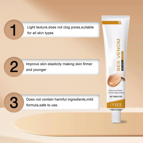 Este creme de veneno de abelha ajuda a reduzir rugas e linhas finas, proporcionando uma aparência mais jovem e renovada.