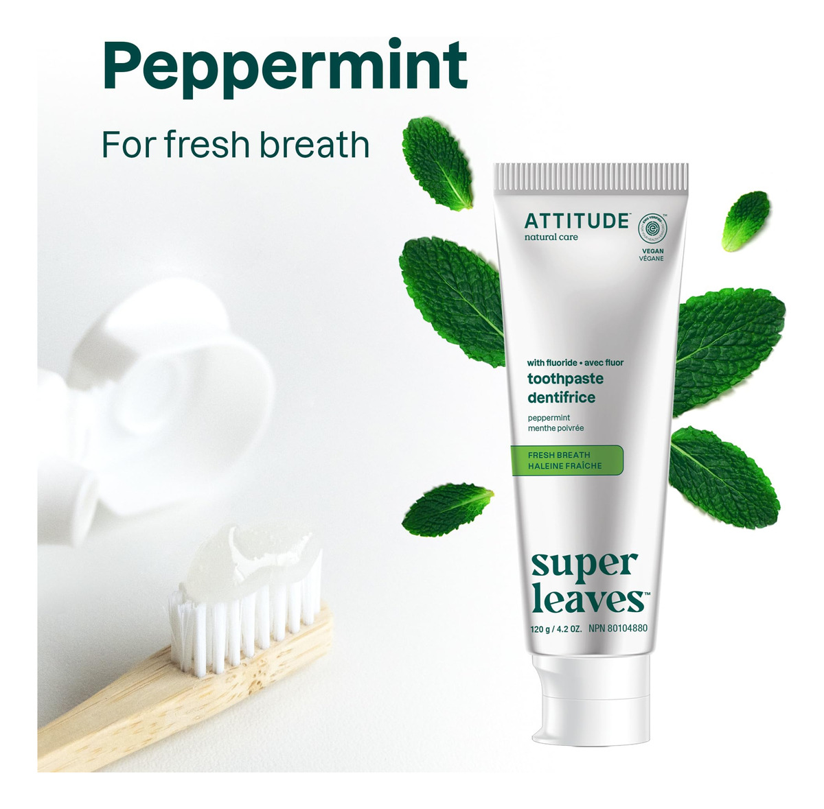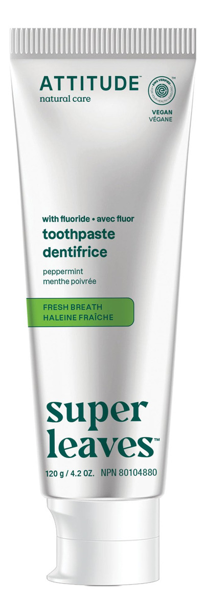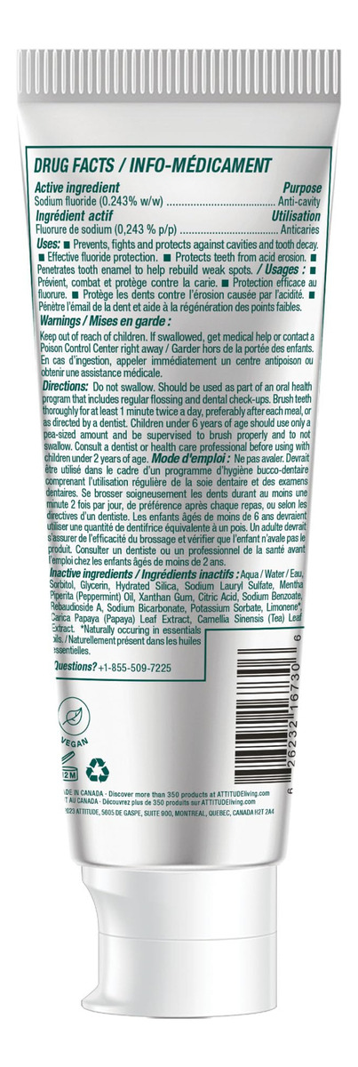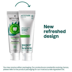Pasta de dente ATTITUDE com flúor, previne cáries e cáries dentárias, vegana, sem crueldade e sem açúcar, hálito fresco, hortelã, 4,2 onças — Creme dental vegetal VERDADEIRAMENTE EFICAZ: contém fluoreto de sódio, que ajuda a proteger os dentes contra cáries e erosão — PASTA DE DENTES FEITA COM INGREDIENTES ATENCIOSOS: Feita com ingredientes vegetais e minerais, como folhas de chá verde, que têm propriedades antioxidantes e ajudam a manter uma boa saúde bucal e dental e folhas de mamão, que contêm papaína, e combinada com a escovação, essa pasta de dente contribui para reduzir a placa bacteriana – PASTA DE DENTE PARA HÁLITO FRESCO: contém um sabor refrescante de hortelã – PASTA DE DENTE SUSTENTÁVEL: Este produto é vegano, o que significa que não contém ingredientes de origem animal e é livre de crueldade. A fórmula também é biodegradável – PASTA DE DENTES VERIFICADA PELA EWG: esta pasta de dente não contém ingredientes preocupantes, de acordo com os cientistas do Environmental Working Group
