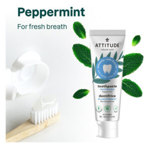 Pasta de dente ATTITUDE com flúor, previne cáries e cáries dentárias, vegana, sem crueldade e sem açúcar, clareadora, hortelã, 4,2 onças — Creme dental vegetal VERDADEIRAMENTE EFICAZ: contém fluoreto de sódio, que ajuda a proteger os dentes contra cáries e erosão — PASTA DE DENTES FEITA COM INGREDIENTES ATENCIOSOS: Feita com ingredientes vegetais e minerais, como folhas de chá verde, que têm propriedades antioxidantes e ajudam a manter uma boa saúde bucal e dental e folhas de mamão, que contêm papaína, e combinada com a escovação, essa pasta de dente contribui para reduzir a placa bacteriana – PASTA DE DENTE PARA DENTES MAIS BRANCOS: contém hidroxiapatita, um agente clareador de origem natural – PASTA DE DENTES SUSTENTÁVEL: Este produto é vegano, o que significa que não contém ingredientes de origem animal e é livre de crueldade. A fórmula também é biodegradável – PASTA DE DENTES VERIFICADA PELA EWG: esta pasta de dente não contém ingredientes preocupantes, de acordo com os cientistas do Grupo de Trabalho Ambiental