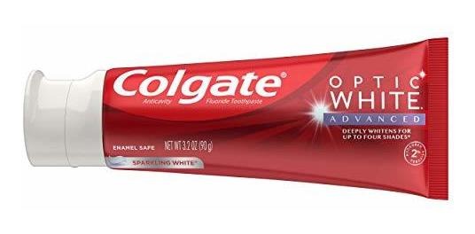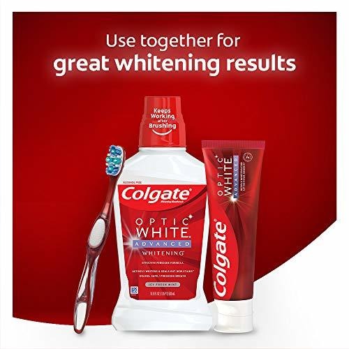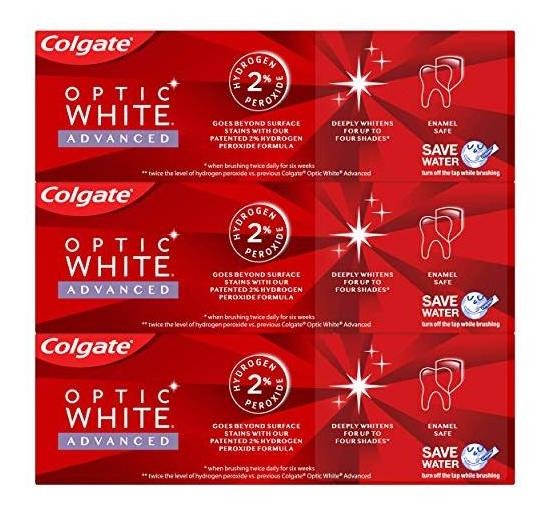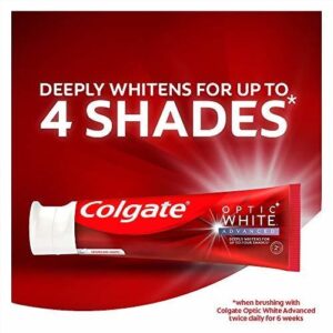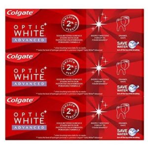 Colgate Optic White Advanced Teeth Whitening Toothpaste, 2% Hydrogen Peroxide Toothpaste, Sparkling White, 3.2 Oz, 3 Pack – Three 3.2 oz. tubes of Colgate Optic White Advanced Whitening Toothpaste – Get a bold, confident smile with this hydrogen peroxide toothpaste that contains Colgates patented 2% hydrogen peroxide formula – Enamel-safe for daily use and fights stains – Optic White Advanced deeply whitens up to four shades* and helps whiten teeth both inside and out (*when brushing twice daily for 6 weeks) – Sparkling White mint toothpaste is a white paste with a cool, herbal minty wintergreen flavor