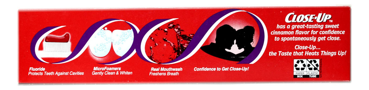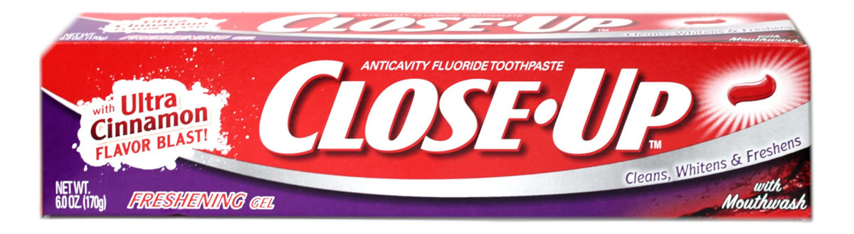 Creme dental com flúor anticavity Close Up Refreshening clareia os dentes. A pasta de dentes original com enxaguatório bucal. Flúor que combate cavidades. Um verdadeiro enxaguante bucal para um hálito fresco. Sistema de clareamento exclusivo. Às vezes, você não se sente tão confiante quanto gostaria em situações sociais ou de trabalho. Deixe que o Close-Up lhe dê a confiança adicional de que você precisa para se afirmar. O Close-Up oferece um sistema de clareamento exclusivo para iluminar seu sorriso, um verdadeiro enxaguante bucal para um hálito fresco de longa duração e flúor para proteção de cáries – tudo o que você precisa para ter a melhor aparência e se sentir bem. E o gel vermelho refrescante Close-Up tem um sabor de canela de excelente sabor para um sorriso refrescante e limpo. O creme dental original com enxaguante bucal Sistema de clareamento exclusivo Hálito fresco de longa duração. Flúor que combate cavidades. Ótimo sabor de canela para um sorriso limpo e refrescante. Detalhes O Close-Up tem um sabor doce de canela de excelente sabor para que você possa se aproximar espontaneamente. Micro Foamers limpa e branqueia suavemente. O gel vermelho com flúor protege os dentes contra cáries. Refresca com enxaguante bucal Auxilia na prevenção da cárie dentária. Instruções: Adultos e crianças de 2 a 6 anos de idade ou mais: escove bem os dentes, de preferência após cada refeição ou pelo menos duas vezes ao dia, ou conforme orientação de um dentista ou médico. Crianças de 2 a 6 anos: use apenas uma quantidade do tamanho de uma ervilha e supervisione a escovação e o enxágue da criança para minimizar a deglutição) Crianças menores de 2 anos: consulte um dentista ou médico ADVERTÊNCIAS: Não engula Mantenha fora do alcance de crianças menores de 6 anos idade Se mais do que o usado para escovar for engolido acidentalmente, procure ajuda médica ou entre em contato imediatamente com um Centro de Controle de Intoxicações. – PASTA DE DENTES REFRESCANTE: Refresca o hálito e clareia os dentes – COMBATE A CÁRIE: Contém um sistema de clareamento exclusivo, contém flúor para ajudar a prevenir cáries – DURADOURO: com um sabor delicioso de canela para um sorriso refrescante e limpo – CONFIANT BOOST: verdadeiro enxaguante bucal para um hálito fresco – GEL VERMELHO: deixa seus dentes mais limpos, brancos e brilhantes