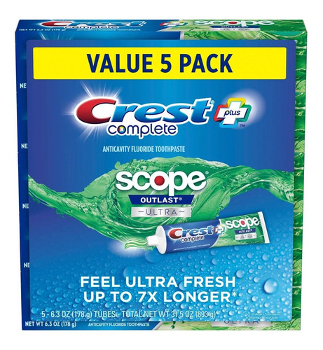 Obtenha o frescor do Scope em uma pasta de dente. O creme dental branqueador completo Crest + Scope tem os benefícios do creme dental Crest com a adição de frescor Scope. Mate milhões de germes do mau hálito * e deixe seu hálito revigorado e mentolado. A escovação regular com creme dental com flúor ajuda a prevenir a cárie dentária, retardando a quebra do esmalte e aumentando a taxa do processo de remineralização.