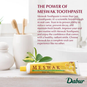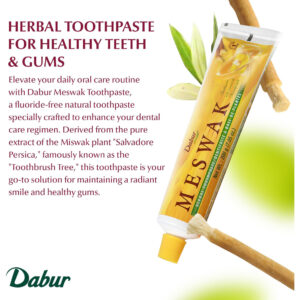 Pasta de dente Dabur Meswak – Pasta de dente sem flúor, pasta de dente natural para saúde bucal e gengival, pasta de dente para cuidados dentários. Pasta de dente natural com essência de Miswak, pasta de dente diária para higiene bucal — DESCUBRA O PODER DO MESWAK: Nosso creme dental aproveita a rara e potente erva Miswak, proveniente das paisagens resilientes da África e do Sul da Ásia. De crescimento lento e resistindo às forças da natureza, Miswak é uma erva maravilhosa de valor inestimável, cuidadosamente selecionada para sua saúde bucal. – FORTALEÇA A ADERÊNCIA DAS GENGIVAS: eleve sua rotina de higiene bucal com o creme dental herbal da Dabur enriquecido com extrato natural de Miswak. Experimente o efeito adstringente robusto do Miswak, conhecido por reduzir clinicamente o mau hálito e aumentar a força da gengiva. Os taninos em Miswak inibem a glicosiltransferase, reduzindo a placa bacteriana e promovendo a saúde geral da gengiva. – SENSAÇÃO INCRÍVEL NA BOCA: saboreie o sabor fresco distinto que nosso creme dental totalmente natural traz à sua experiência de escovação. Feito com ingredientes de sabor idênticos à natureza, o Dabur Meswak proporciona uma sensação oral incomparável, deixando você com uma sensação refrescante e satisfatória após cada uso. – PROTEÇÃO: Descubra o escudo natural para seus dentes e gengivas com a pasta de dentes à base de ervas da Dabur. Nosso creme dental totalmente natural, enriquecido com o poder do Meswak, não só fornece proteção eficaz, mas eleva sua rotina de higiene bucal. Abrace a pureza da natureza com a Dabur, garantindo que sua saúde bucal seja fortalecida contra substâncias nocivas. – UMA MARCA EM QUE VOCÊ PODE CONFIAR: A Dabur está no mercado desde então, e é por isso que estamos comprometidos em fornecer produtos autênticos e de qualidade para clientes em todo o mundo. Nós nos esforçamos e estamos sempre em busca de inovação para oferecer produtos que possam ajudar as pessoas a viverem vidas mais saudáveis.